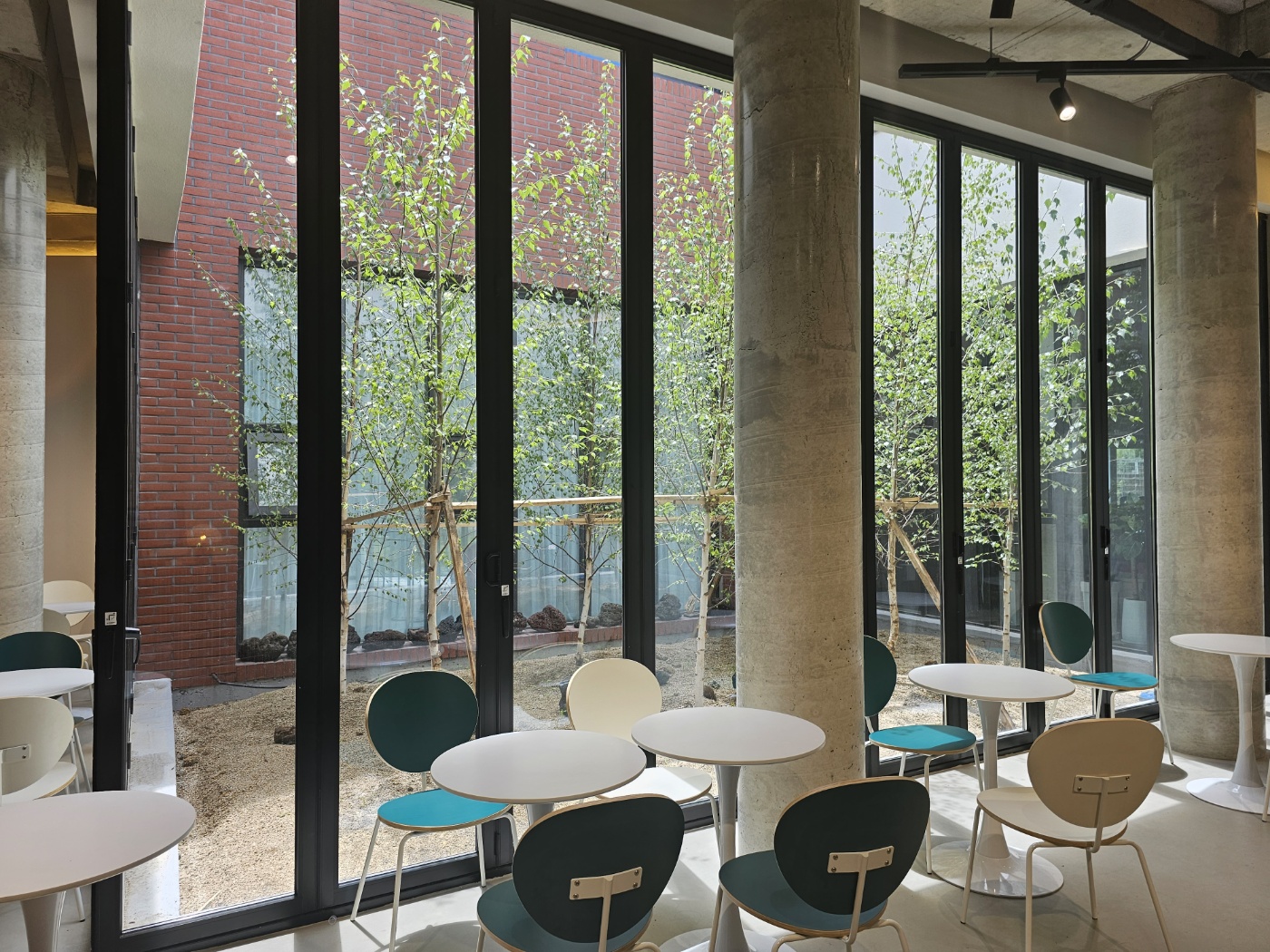 일단 처음 반기는 외관이 건축가가 신경 써서 지은 듯한 비주얼로 군더더기 없는 깔끔한 디자인입니다. 문을 비스듬히 내어 유니크하고 멋스러워 시선을 사로잡습니다. 하늘과 자연과 건물이 어우러져 더욱 돋보이는 감각적 외관을 자랑합니다. 주차장이 넓어 초보 운전자도 쉽게 주차 가능할 듯합니다. 입구에 들어서면 스마일 발 매트가 반겨줍니다. 어서 오세요~^^ 내부는 전체적으로 밝은 그레이와 진초록, 벽돌색이 어우러져 조화롭고 아늑해 보입니다. 천장은 오픈형이라 개방감이 있고 공간을 더 넓어 보이게 합니다. 내부에는 중정이 있고 나무가 심어져 있습니다. 그곳으로 햇살이 잔잔하게 들어와 자연스러운 빛과 그림자를 만들어줍니다. 곳곳에 스피커, 스탠드, 돌 등 깨알 같은 소품들이 센스가 넘칩니다. 붙박이 의자 밑으로 자리마다 콘센트가 위치해 있습니다. 휴대폰 충전 및 노트북 충전 가능합니다~화장실도 깔끔해서 이용하는데 불편함이 없습니다. 전체적으로 외부과 내부 모두 깔끔하면서도 감각적인 가로수길 느낌의 스타일 입니다. 개인적으로 이런 느낌적인 느낌 너무 좋습니다~^^