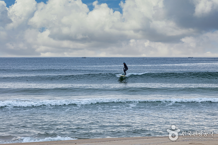 대나무가 빼곡한 섬 '죽도' 와 연결되어 있는데, 이 섬 이름을 따 죽도해수욕장이라 부릅니다. 해변에는 2km의 아름다운 모래사장이 길게 펼쳐져 있고, 모래사장 뒤로는 울창한 소나무 숲이 자리합니다. 수심이 낮고 경사가 완만한 편이라 어린이가 있는 가족 단위 피서객에게 사랑받는 곳입니다. 주변에 크고 작은 바위가 많아 바다밖시꾼들도 주로 찾습니다. 바다에서 서핑도 가능한데, 주변에 서핑 강습과 장비 대여를 하는 서핑샵이 여럿 있습니다. 걸어서 오를 수 있는 죽도봉 정상에 서면, 넘실대는 동해의 풍광이 파노라마로 펼쳐집니다. 서핑의 천국 죽도 해수욕장입니다.