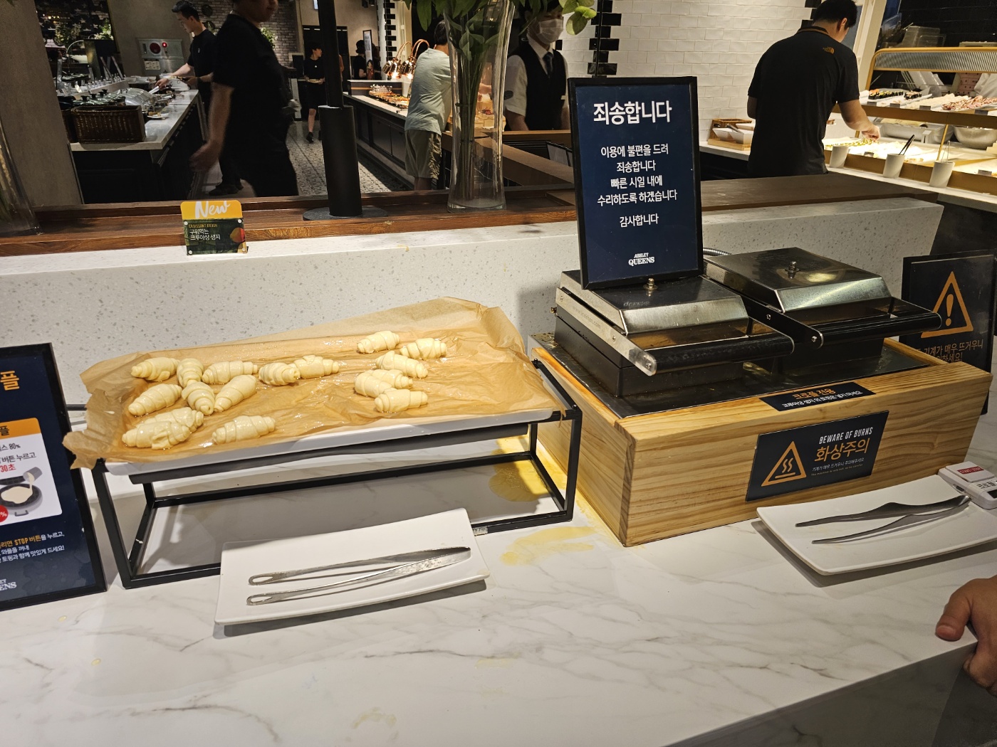 배가 고파서 앉지도 않고 소지품만 대충 내려놓은 뒤 접시를 집어 들었습니다. 슥 눈으로 스캔하고 빠르게 두 접시를 담았습니다. '조금씩 모든 메뉴를 맛보자'를 목표로 호기롭게 시작했습니다. 접시가 크지 않아서 많이 담을 수가 없어 아쉬워하며 하나씩 담아봅니다. 배가 많이 고팠지만 하나씩 다 맛보고 싶었습니다. 하지만 세 접시 정도 먹으니 배가 불러 더 이상 못 먹을 듯합니다. 다양하게 조금씩 담았는데도 다 담지 못할 만큼 메뉴가 많았습니다. 대체로 간이 세고 매콤 달콤한 자극적인 맛의 음식이 많아 음료나 물을 자꾸 찾게 됩니다. 그래서 더 빨리 배가 불러오는 듯했습니다. 세 접시까지 먹고 포기~^^ 주말이라 사람이 많아 회전율이 좋습니다. 모든 음식이 식지 않고 따뜻했던 것 같습니다. 배가 불러도 디저트는 먹어야 합니다. 왼쪽에서 와플을 굽고 오른쪽에서 크로플을 구워보았습니다. 아들이 초코도 발라줍니다. 아들아~ 엄마는 초코를 좋아하지 않는단다~ ㅎㅎㅎ 그래서인지 크로플이 훨씬 맛있습니다~ 에스프레소에 밤맛 아이스크림을 넣어 아포카토도 먹어보았습니다. 뷔페에 갔다면 이건 꼭 먹어야 합니다~^^