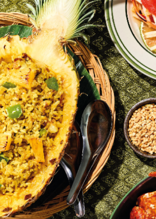 · 카레 카오 팟 쌉빠룻 (파인애플 카레 볶음밥)- 파인애플의 상큼한 단맛과 카레의 진하고 향긋한 풍미를 느낄 수 있는 카레 볶음밥입니다. 짭조름하고 톡 쏘는 맛과 매콤함이 조화를 이룹니다.