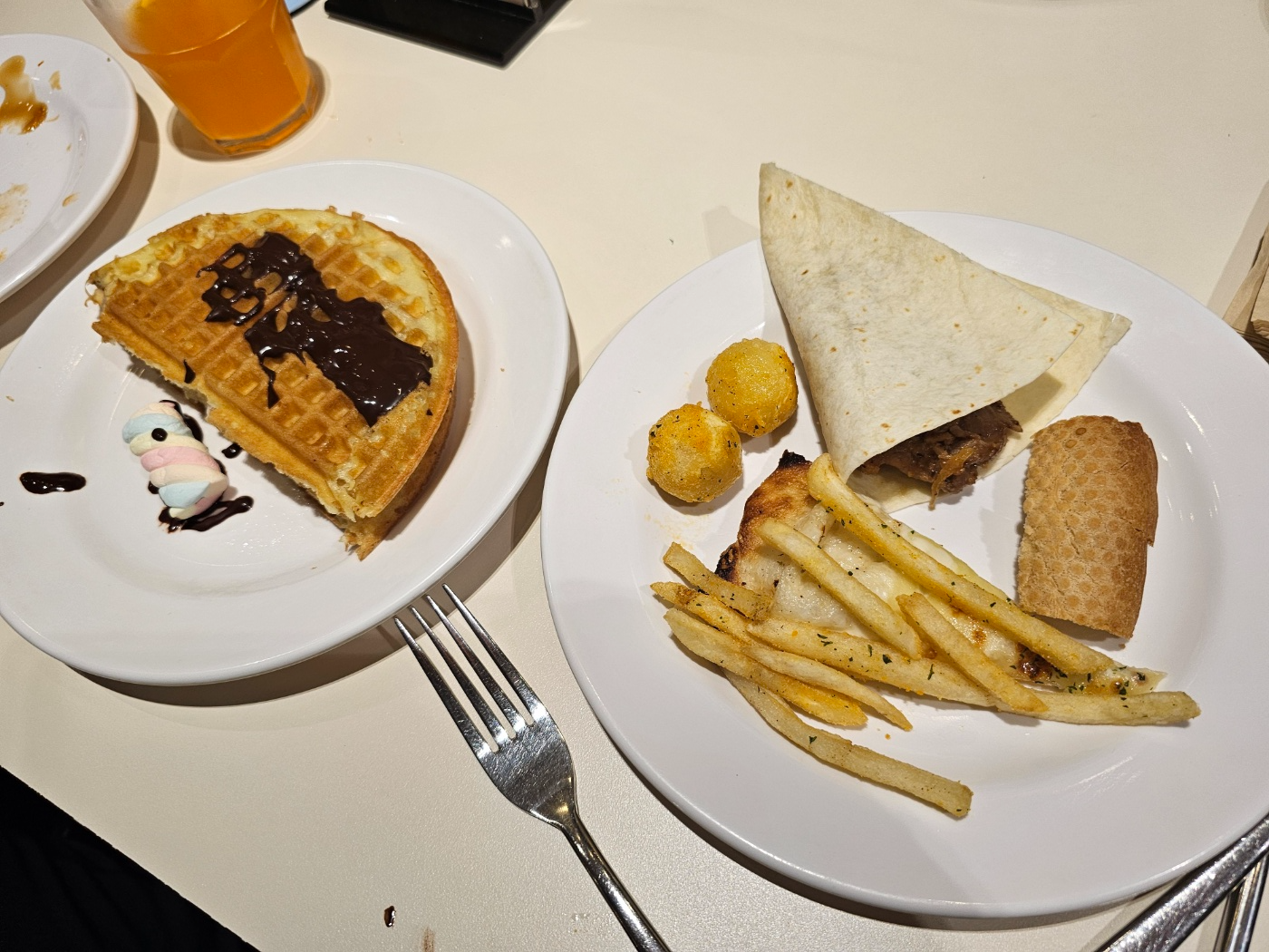 배가 고파서 앉지도 않고 소지품만 대충 내려놓은 뒤 접시를 집어 들었습니다. 슥 눈으로 스캔하고 빠르게 두 접시를 담았습니다. '조금씩 모든 메뉴를 맛보자'를 목표로 호기롭게 시작했습니다. 접시가 크지 않아서 많이 담을 수가 없어 아쉬워하며 하나씩 담아봅니다. 배가 많이 고팠지만 하나씩 다 맛보고 싶었습니다. 하지만 세 접시 정도 먹으니 배가 불러 더 이상 못 먹을 듯합니다. 다양하게 조금씩 담았는데도 다 담지 못할 만큼 메뉴가 많았습니다. 대체로 간이 세고 매콤 달콤한 자극적인 맛의 음식이 많아 음료나 물을 자꾸 찾게 됩니다. 그래서 더 빨리 배가 불러오는 듯했습니다. 세 접시까지 먹고 포기~^^ 주말이라 사람이 많아 회전율이 좋습니다. 모든 음식이 식지 않고 따뜻했던 것 같습니다. 배가 불러도 디저트는 먹어야 합니다. 왼쪽에서 와플을 굽고 오른쪽에서 크로플을 구워보았습니다. 아들이 초코도 발라줍니다. 아들아~ 엄마는 초코를 좋아하지 않는단다~ ㅎㅎㅎ 그래서인지 크로플이 훨씬 맛있습니다~ 에스프레소에 밤맛 아이스크림을 넣어 아포카토도 먹어보았습니다. 뷔페에 갔다면 이건 꼭 먹어야 합니다~^^