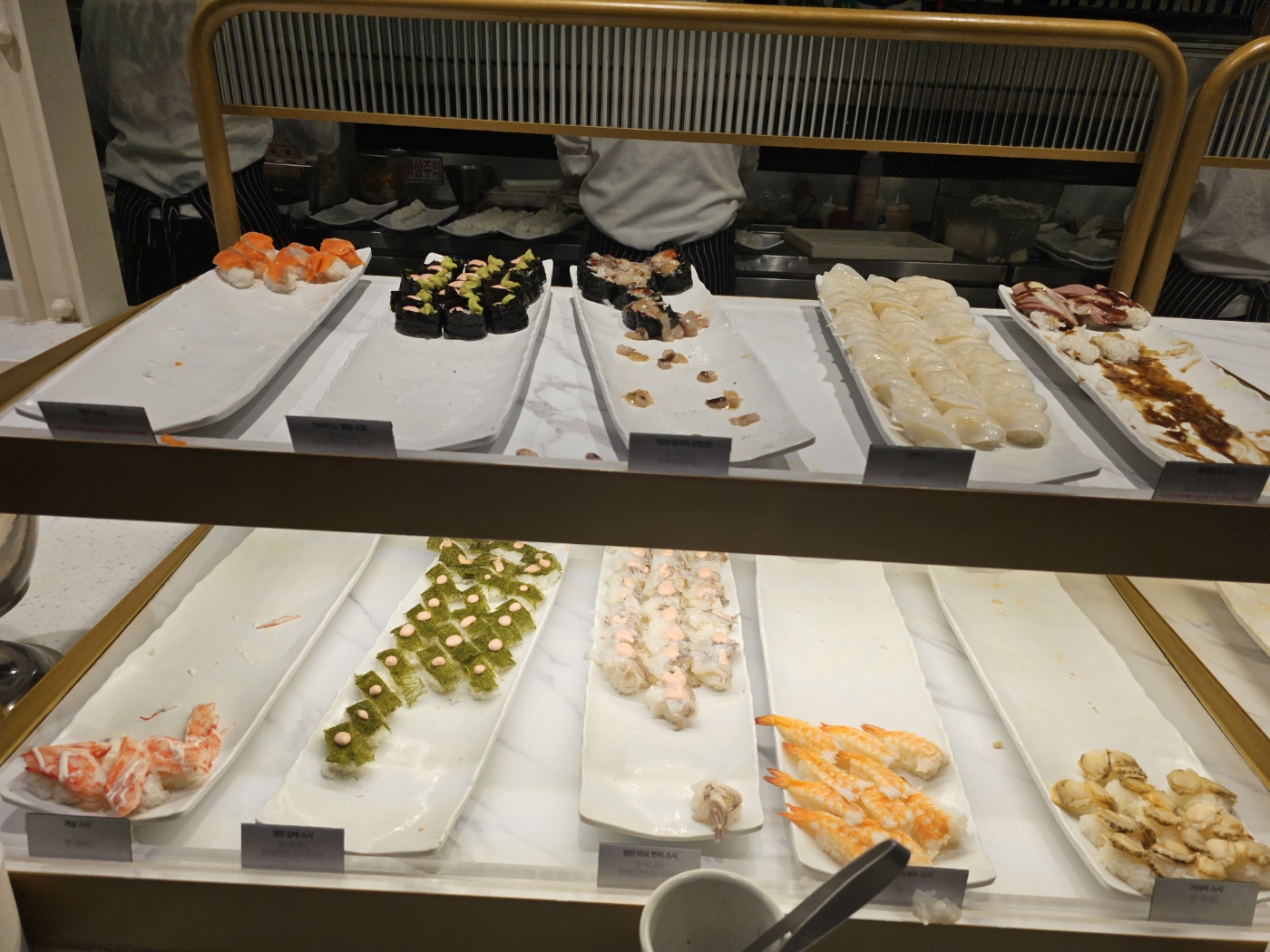 연어 스시 / 아보카도 명란 군함 / 타코 와사비 군함 / 한치 스시 / 훈제 오리 스시 / 게살 스시 / 명란 감태 스시 / 명란 마요 한치 스시 / 초새우 스시 / 간장 새우 스시 / 새우튀김 스시 / 가리비 스시 / 멍게 스시 / 헬시롤 / 해파리 스시 / 슈림프 소바 마끼 / 묵은지 스시 / 계란 스시 / 장어 스시 / 우삼겹 롤 / 스파이시 캘리포니아 롤 / 유부초밥 / 훈제연어 등
