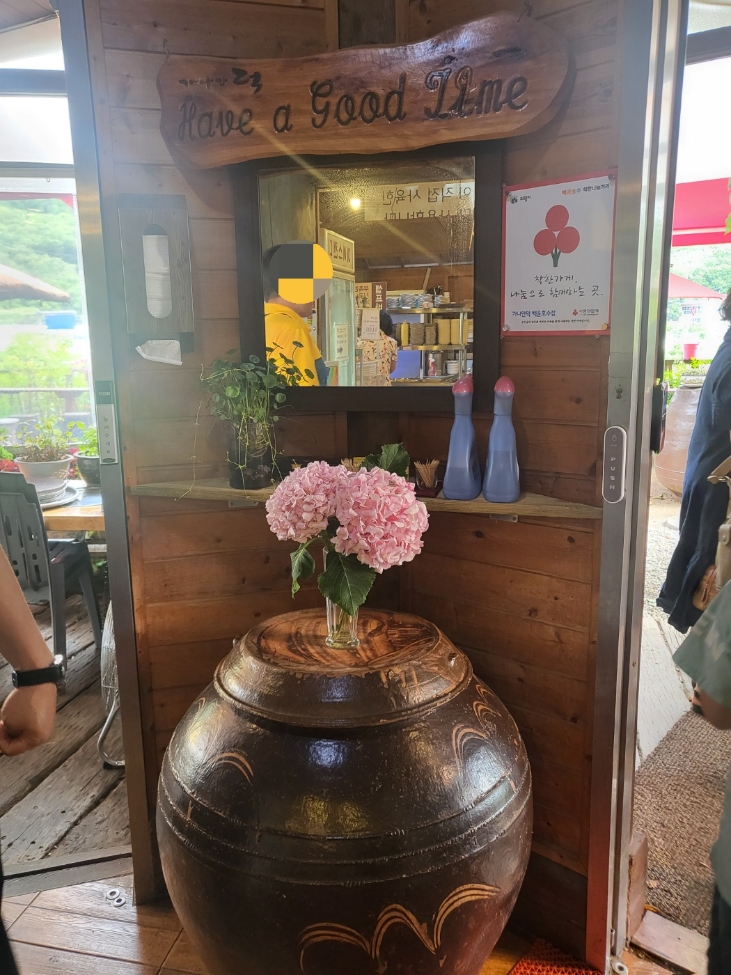 내부는 고급스럽지는 않지만 왠지 친숙한느낌 입니다. 건물이 나무로 지어졌고 내부 마감도 나무로 되어있어 고즈넉한 분위기입니다. 안팎으로 초록 초록, 푸릇푸릇합니다. 멀리 보이는 청계산 뷰부터 야외에 풀들과 꽃들, 내부에 화분들까지 피톤치드를 마구 뽑아내주어 자연 속에 있는듯한 느낌입니다. 1층에는 넓은 홀 안의 테이블과 야외가 훤히 보이는 야장 느낌의 테이블도 몇 개 있습니다. 야외에도 테이블이 있습니다. 2층도 있는데 홀이 넓고 1층보다 좌석이 더 많은 듯합니다. 저희는 비도 내리고 하니 1층 야장 느낌의 자리에서 식사하였습니다,