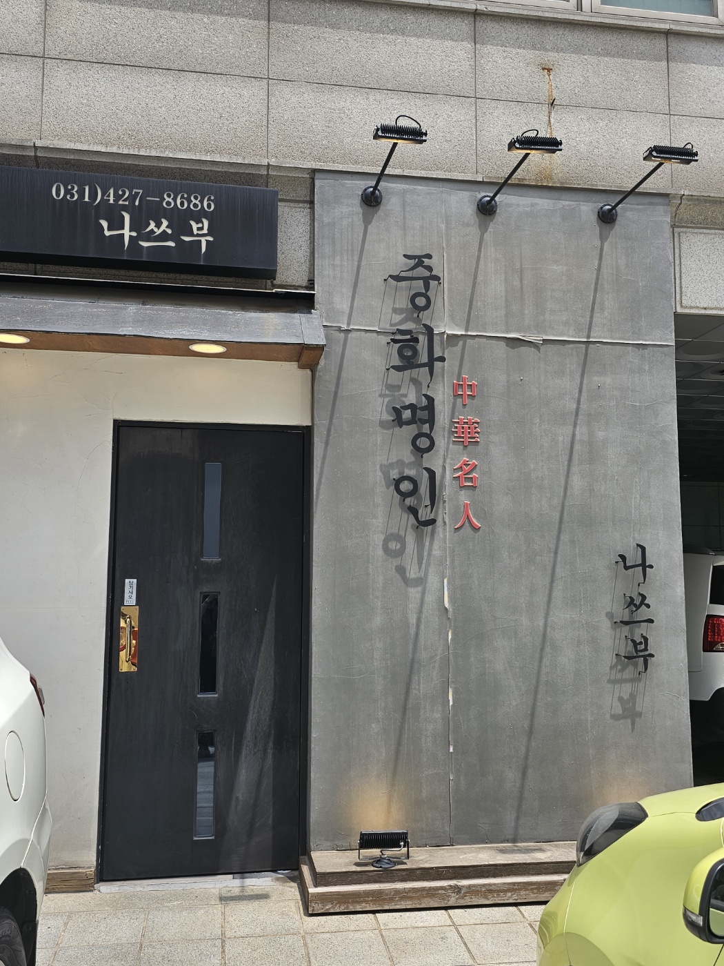 외부는 중국집 스럽지 않습니다. 안양에 오래 살았던 사람들도 맛집에 관심이 없다면 여기 중국집이 있는지 잘 모릅니다. 블랙, 화이트, 그레이톤의 색감에서, 간판의 여백에서 고급스러움이 느껴집니다. 외부에 가로로 길게 난 창이 나 있어 고급 일식집 같은 느낌도 살짝 납니다. 넓은 대리석 면에 중화명인, 나쑤부 라고 쓰여있습니다. 절제된 여백과 상, 하부의 조명으로 명인의 자존심을 표현한 듯 합니다. 오래되어 이음매가 다 터져있습니다. 세월의 흔적이 느껴지는만큼 장수한 맛집임을 의미합니다.
