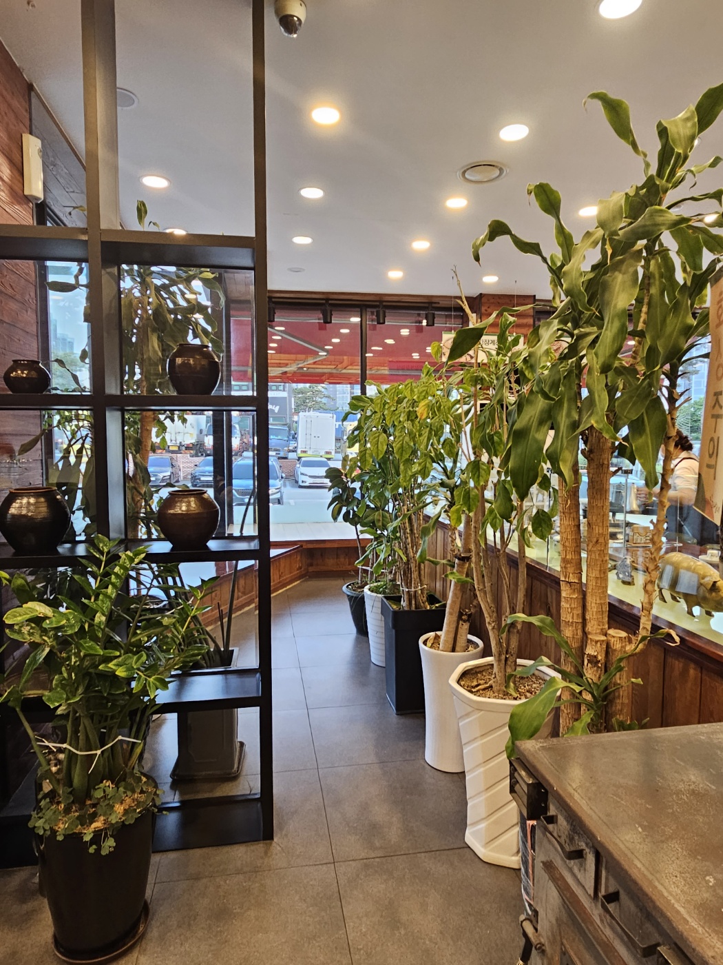외관이 웅장합니다. '밥 한 그릇에 마음을 담다', '밥심', '곤드레밥집' 일관되게 '밥'을 강조하는 간판들입니다. 안으로 들어서면 오픈 주방이 보입니다. 오픈 주방 앞쪽으로 테이블이 넓은 간격으로 배치되어 있습니다. 유명한 한정식 맛집답게 매장 규모가 상당히 넓습니다. 여러 가지 마감재를 사용하였지만 매장이 넓어서, 같은 컬러감이 반복되어 조화롭게 어우러집니다. 그린, 우드, 브라운 계열로 통일한 듯 보입니다. 특히 곳곳에 식물들과 소품, 액자들을 곳곳에 배치하여 고급스럽고 중후한 느낌을 줍니다. 안쪽에는 셀프바가 있습니다. 밥과 반찬 필요한 만큼 가져다 드실 수 있습니다. 곤드레 밥은 아니지만 흰쌀밥 리필 가능하고 샐러드, 묵, 김치, 사과 등이 셋팅되어 있습니다. 잡채는 직원에게 요청하시면 됩니다. 셀프바에도 우드와 벽돌 마감재를 사용하여 고풍스러운 느낌인데... 저 위에 Self 표시판이 깹니다. ㅎㅎㅎ