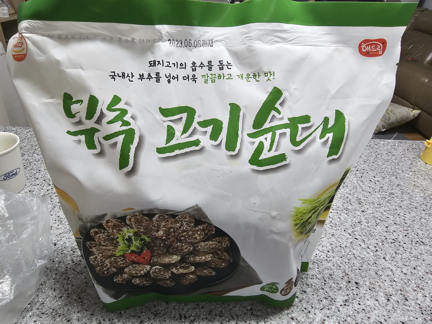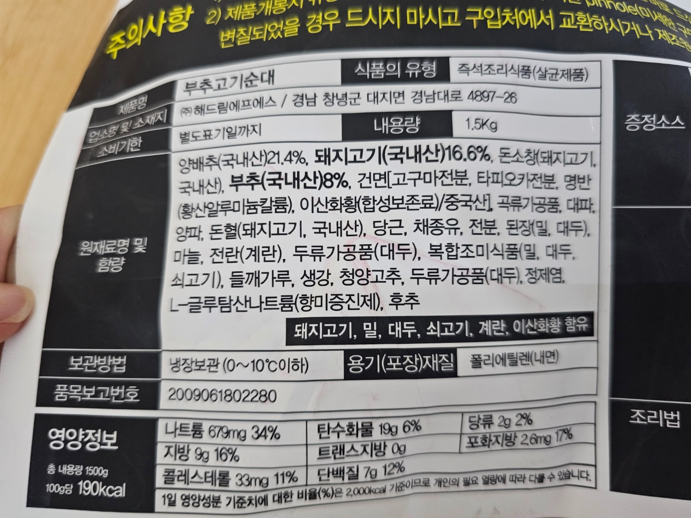순대 재료로는 양배추, 돼지고기, 돈소창, 부추, 건면, 이산화황, 곡류가공품, 대파, 양파, 돈혈, 당근, 채종유, 전분, 된장, 마늘, 전란, 두류가공품, 복합조미식품, 들깨가루, 생강, 청양고추, 두류가공품, 정제염, L-글루탐산나트륨, 후추가 있네요~고기 야채 이외에도 여러 가지 야채가 들어갑니다. 돼지고기와 부추, 양배추 등 주재료는 국내산입니다. 재료 좋습니다~^^