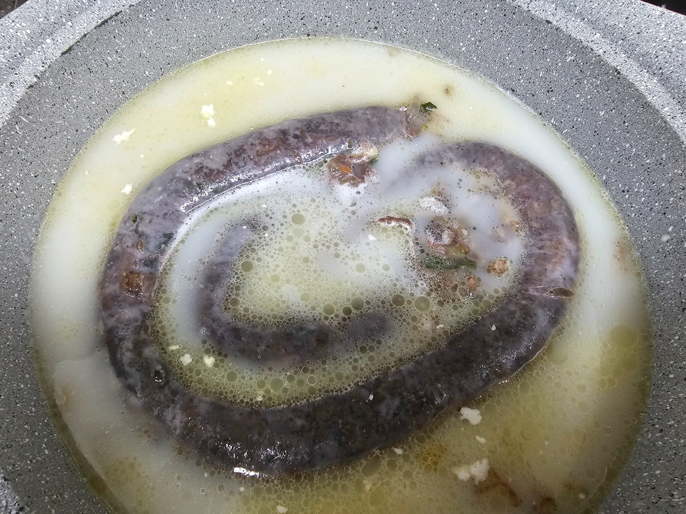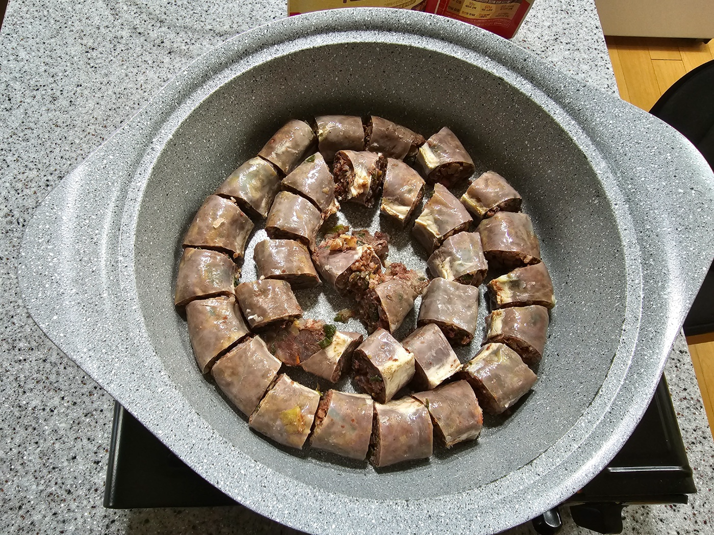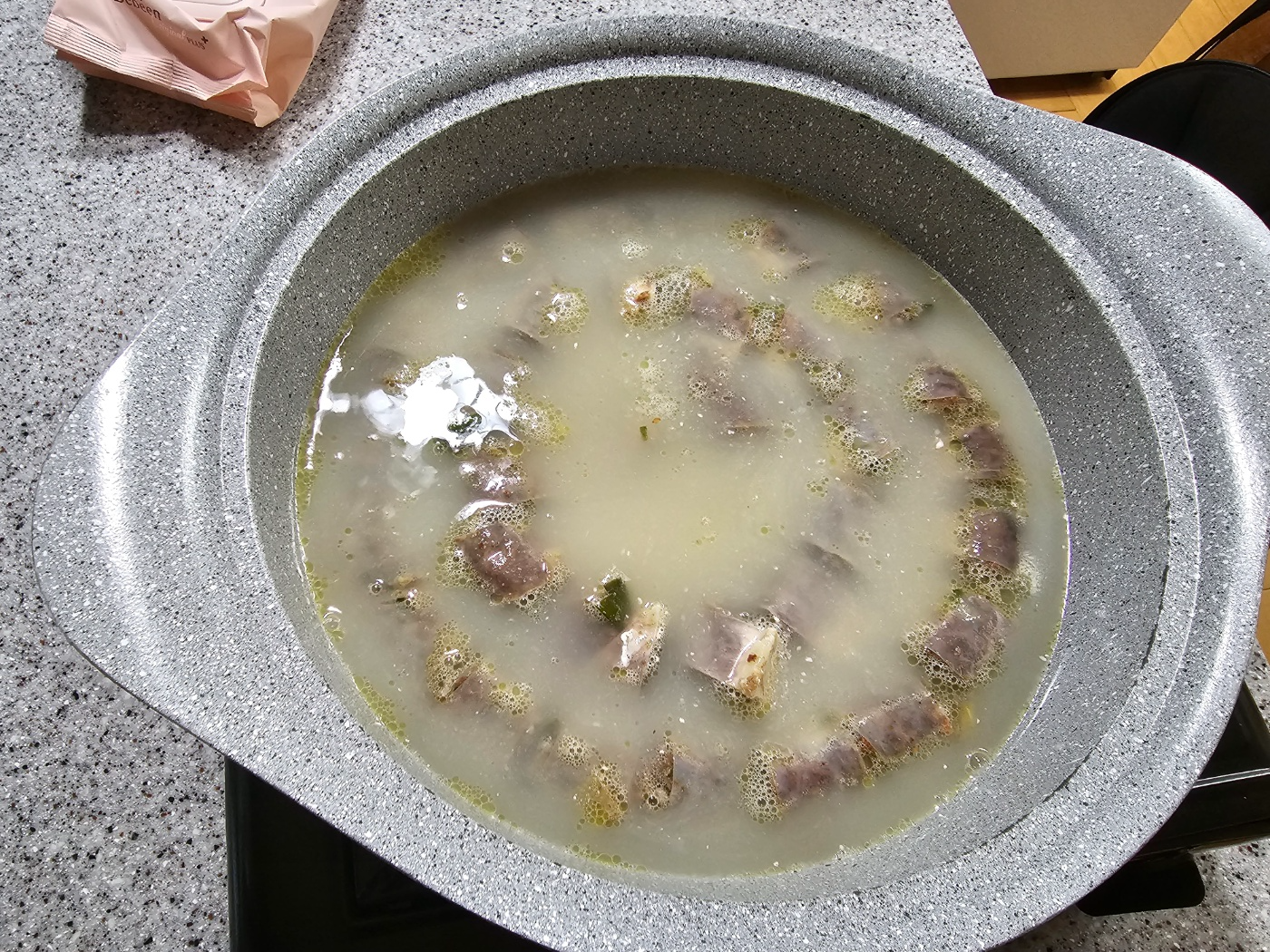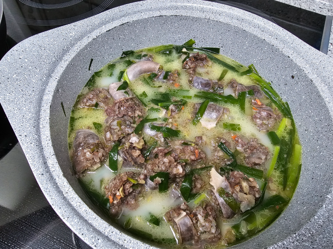 그래서 한 번 더 도전해 보았습니다. 이번에는 순대를 썰지 않고 그대로 넣어줍니다. 위에 곰탕 국물을 붓고 끓였습니다. 부추를 얹어주고 한소끔 더 끓여준 후 순대는 먹기 전 가위로 잘라주었습니다. 이렇게 하니 온전한 순대의 형태를 잃지 않았습니다. 그리고 도마와 칼과 잔 부스러기도 없었습니다. 아래 방법을 추천드립니다.