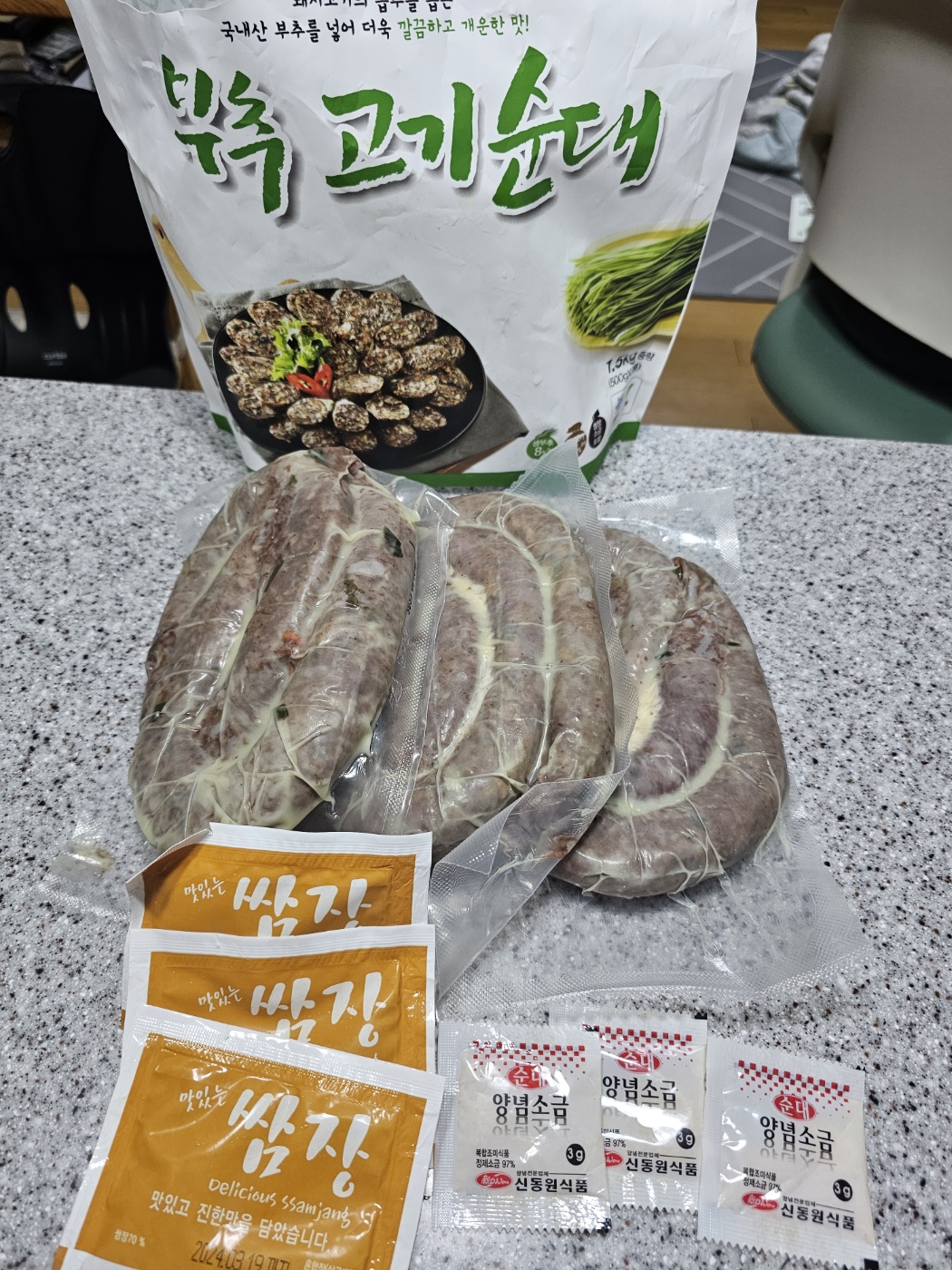 내용물을 살펴보면 500g 부추고기순대 3팩과 순대 소스로 쌈장 3봉지, 양념 소금 3봉지가 들어있습니다. 이 넉넉한 구성에 가격은 11,990원입니다. 저는 서울 사람이라 순대 소스는 소금인데 쌈장이 들어있어서 의아했습니다. 알고 보니 부산에선 순대를 쌈장에 찍어 먹는다고 합니다. 전라도는 초장이라는데 구성에 초장은 없습니다. 전라도 입맛도 고려해주심이...^^ 참고로 지영별 순대 찍어 먹는 소스는 서울/경기도는 소금, 충청/강원도는 새우젓, 경상도는 쌈장 or 막장, 전라도는 초장, 제주도는 간장과 고추냉이라고 합니다. 참으로 다양합니다. 다음에 한번 먹어봐야겠습니다~