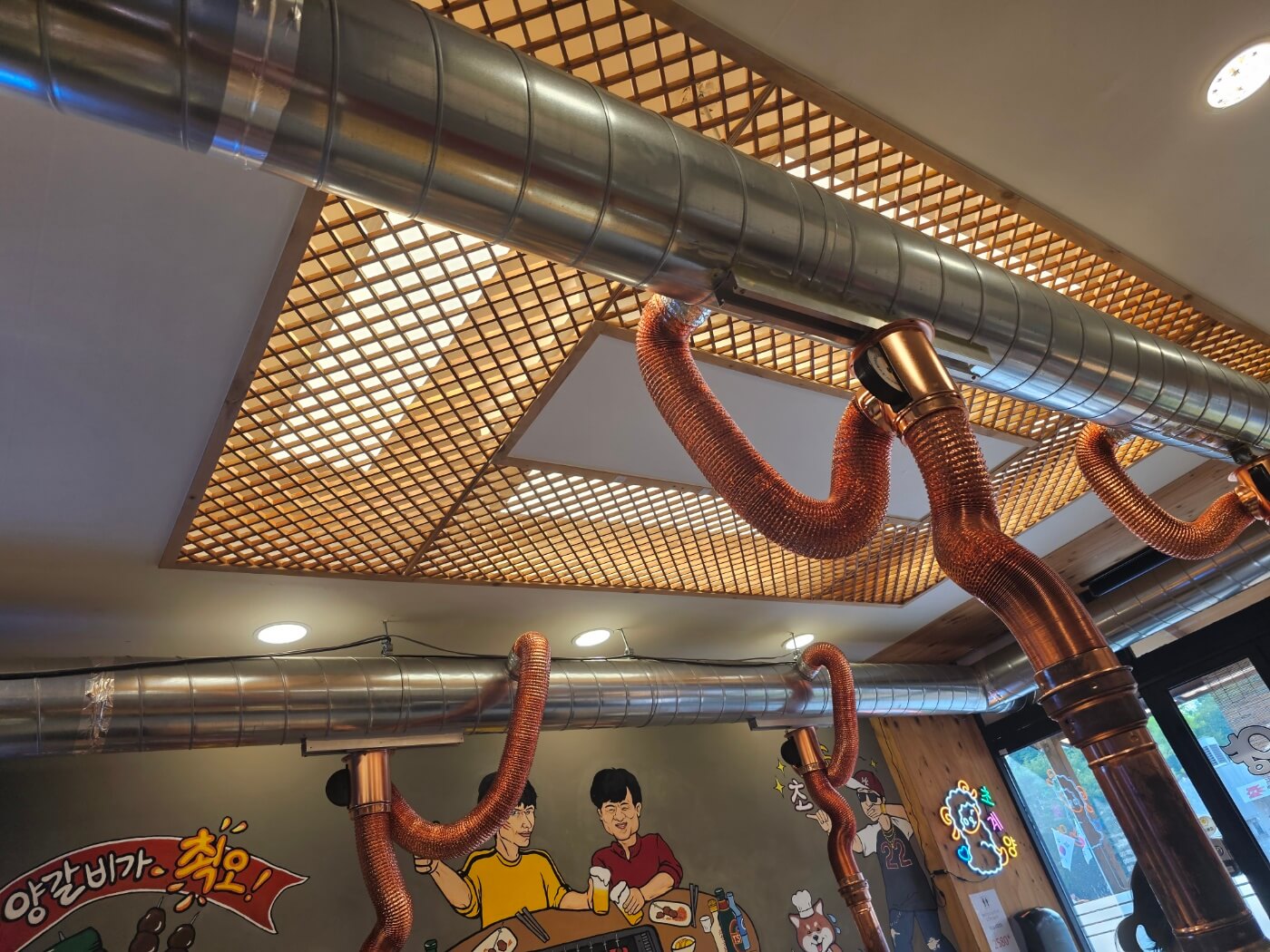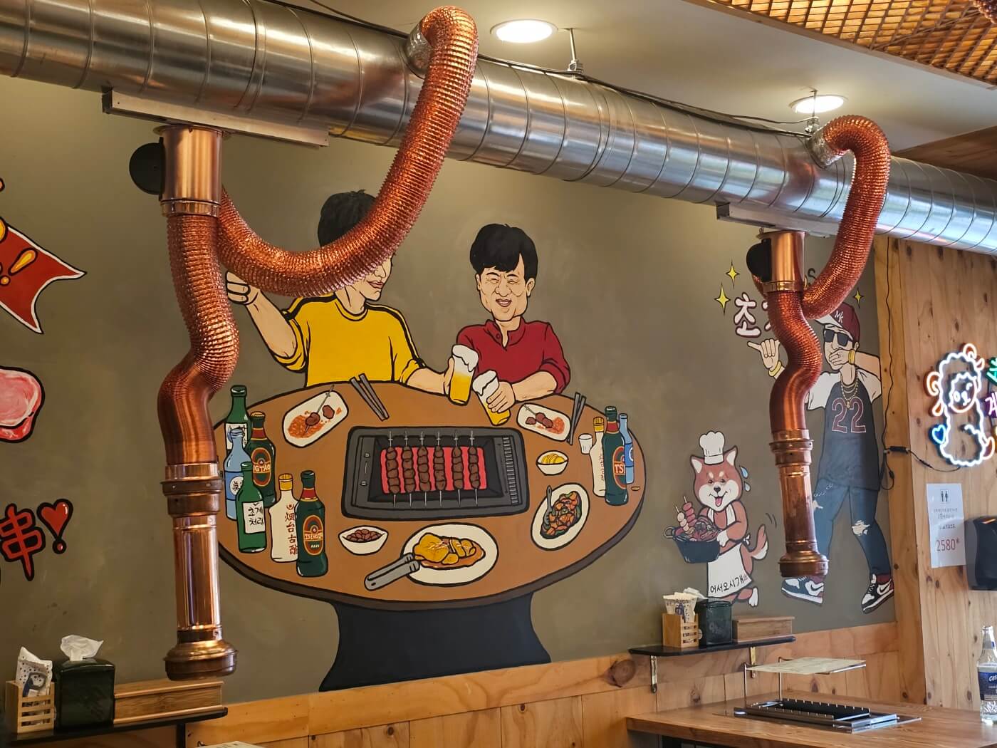 옆 가게 고기 맛집 팔계와 비슷한 인테리어입니다. 테이블마다 꼬치 기계가 매립되어 있고 금빛 후드가 내려옵니다. 벽면에 양꼬치와 다양한 주류를 즐기고 있는 아재 두 분의 벽화가 그려져 있습니다. 의상으로 미루어볼 때 이소룡 님이 아닐까 추측해 봅니다~ ㅎㅎ 입구에는 벽화의 연장선으로 화장실 비번을 크게 적어놓았습니다. 상가 화장실을 이용해야 하고, 비번 2580*입니다.^^ 테이블이 7개 정도 되는 작은 가게입니다. 불금에는 자리가 금방 차니 서두르셔야 합니다. 벽화의 장난스러움과 달리 천장은 우물천장에 우드로 격자 문양을 만들어 고급 집니다. 외부 데크에는 작은 흡연공간이 있고 대나무 장식으로 막아놓아 나름 흡연자들의 프라이버시를 지켜줍니다. 꼬치 기계가 탑재된 저 테이블 너무 갖고싶습니다. 언젠가 우리집에서 저 테이블을 만날 수 있기를 기대해 봅니다~^^ 내부는 에어컨 풀가동 되어 시원하지만 가끔씩 환기를 위해 문을 열어놓을 때는 후덥지근 하니 에어컨 근처 자리를 추천합니다!!