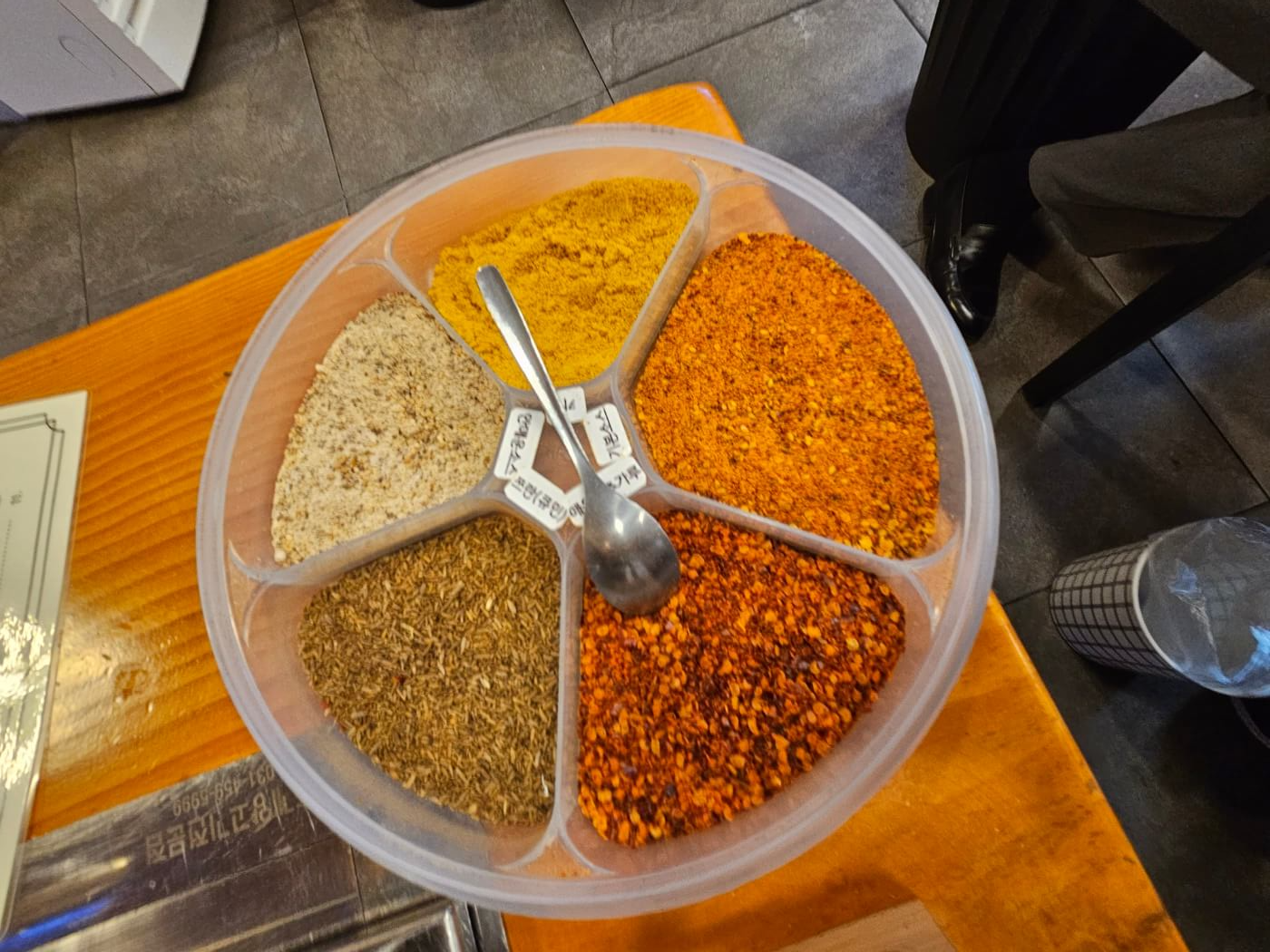 처음에 접시에 양꼬치 기본 소스만 셋팅이 됩니다. 5가지 맛의 소스 통을 가져다주시면 취향에 맞게 첨가하여 찍어 드시면 됩니다. 기본 소스, 매운 고춧가루, 카레, 쯔란(큐민), 안 매운 소스가 들어있습니다. 개인적으로 저는 매운 고춧가루와 쯔란을 조금씩 더 넣어서 먹습니다. 매운맛의 짜릿함을 모르는 초딩 아들은 고소한 안 매운 소스와 카레 가루를 적당히 섞어줍니다. 양꼬치 20개가 가지런히 나왔습니다. 기계에 꽂으면 아름답게 돌아가며 구워집니다. 기름이 떨어지는 쪽에 가끔 불쇼가 일어납니다. 여기선 소금을 뿌려주는데 금방 불길이 잡힙니다. 양고기는 맛과 풍미는 좋으나 냄새 때문에 호불호가 갈리는데 여기 초계 양꼬치에선 걱정 없습니다. 잡내가 하나도 없어서 누구나 즐길 수 있습니다.