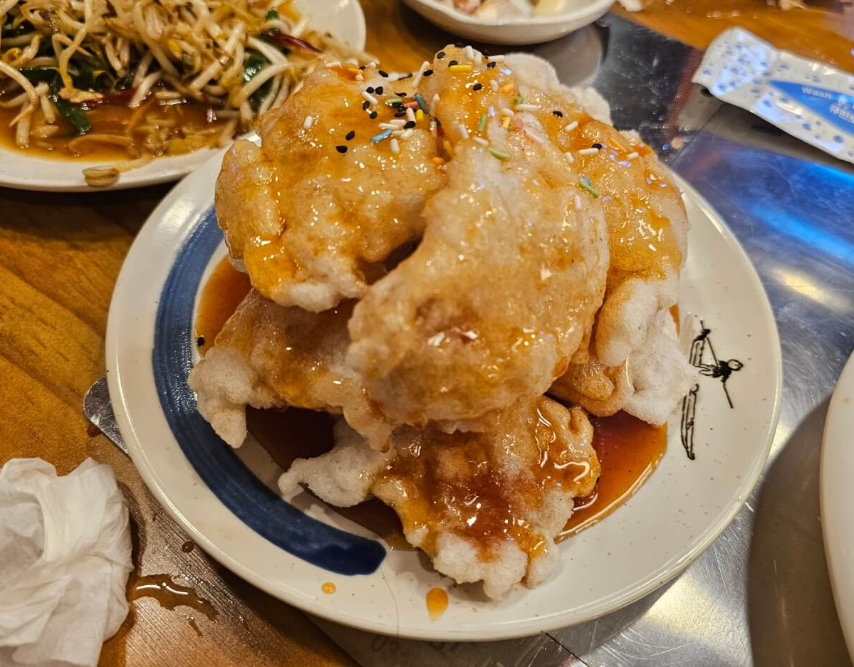 양꼬치에 곁들일 향라새우와 꿔바로우 주문 들어갑니다. 향라새우는 아주 바삭하고 매콤하여 양꼬치의 느끼함을 잡아주고, 고추와 견과류들도 바삭하게 튀겨져 함께 먹으면 술안주에 제격입니다. 손이가요~ 손이가~~~ 향라새우 맛집 인정입니다.^^ 꿔바로우는 바삭바삭하고 고기가 두툼합니다. 달콤한 소스 위로 스프링클 토핑이 올려져 나와 구미를 당깁니다. 바삭바삭 쫄깃쫄깃합니다. 한참 열심히 먹고 있는데 숙주볶음을 서비스로 주십니다. 지난번엔 물만두를 주시더니... 서비스도 좋고 사장님도 친절하십니다~ 저희는 이전에 가지 튀김과 오이 탕탕이, 온면도 먹어보았습니다. 다 맛있었기에 다음번엔 양갈비와 마라탕에 도전해 볼까 합니다.