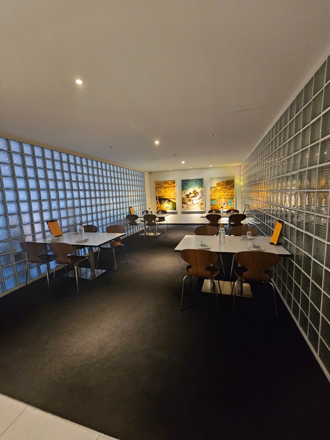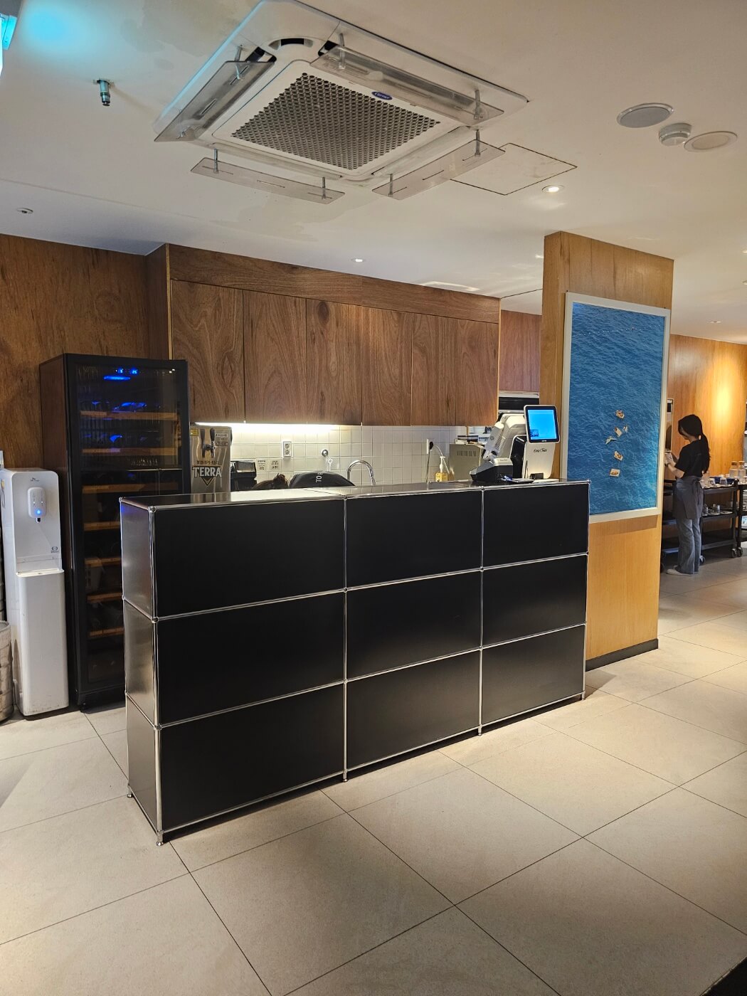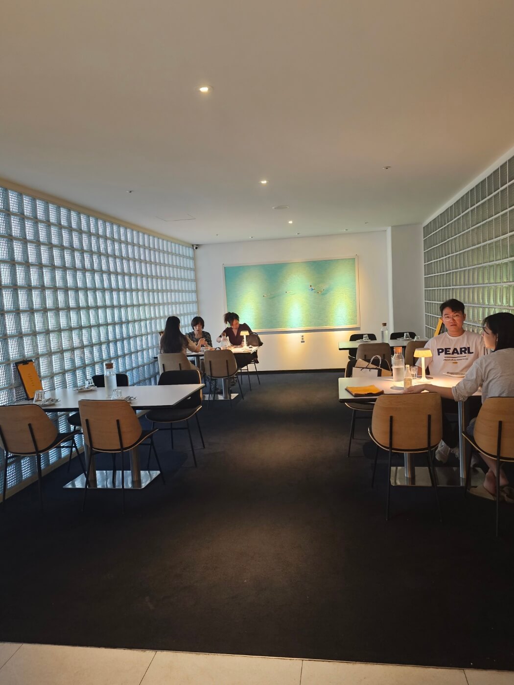 카운터는 원목과 블랙 스텐의 조화로 세련된 느낌을 줍니다. 전체 공간을 4개의 테이블씩 분리하여 중간에 유리블럭 파티션을 세웠습니다. 조금은 프라이빗하게 식사를 즐길 수 있습니다. 유리블럭을 사용하여 자칫 답답할 수 있는 공간에 개방감을 주고, 빛이 투과되어 조도에도 영향을 줍니다.