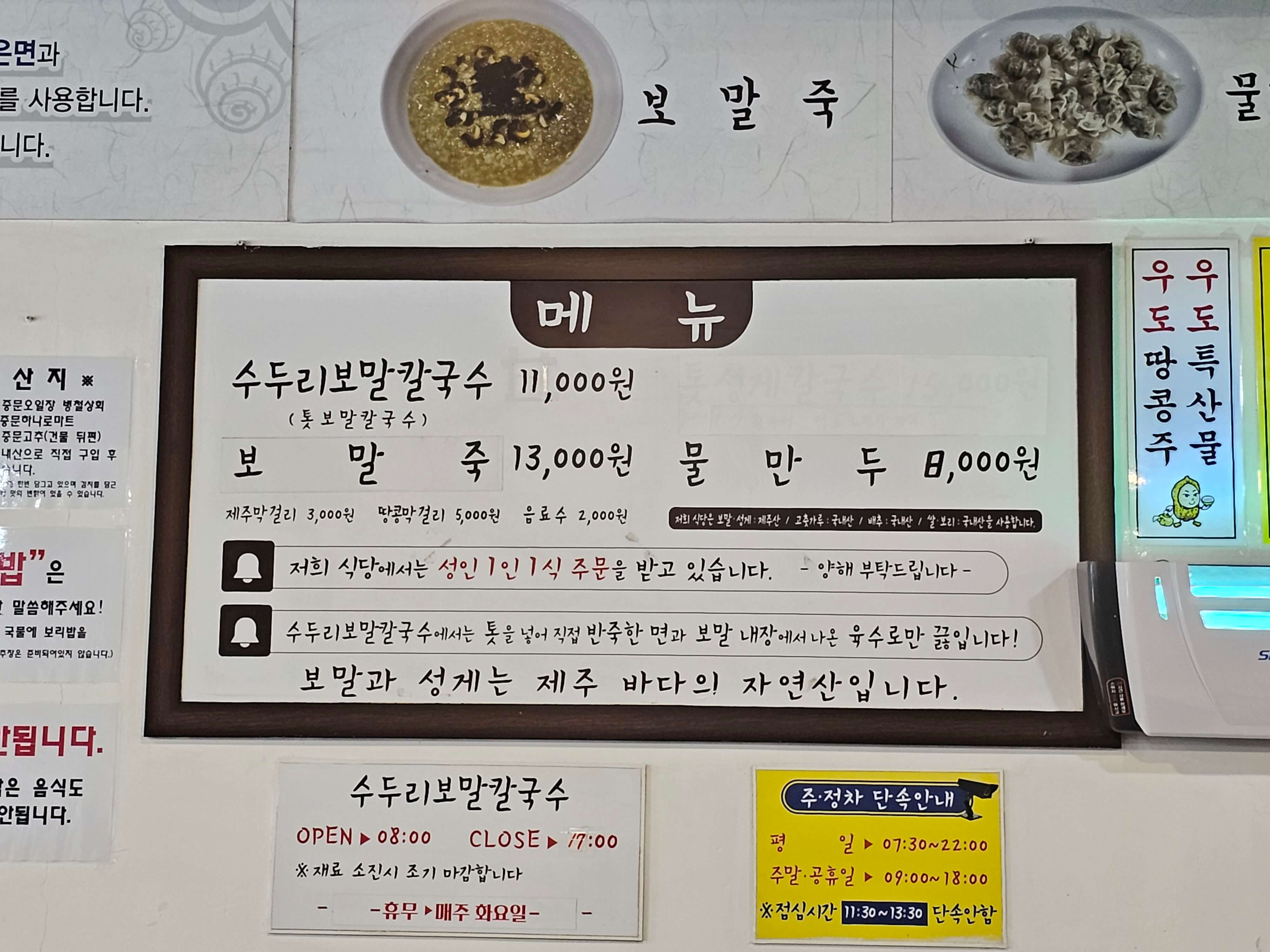 주차장이 따로 없습니다. 매장 내에 주·정차 가능한 구간 안내가 있고 단속되어도 책임지지 않는다는 문구가 있습니다. 지도에 빨간색으로 표시된 부분 골목에 요령껏 주차하시면 됩니다. 골목길 쭉 내려가시면 중문 향토 오일시장이 있고 더 내려가면 중문동 재활용도움센터에 주차장이 있습니다. 저희는 재활용도움센터 주차장에 주차하고 조금 걸어 올라갔습니다. 올라가는 길에 중문보말칼국수라고 푯말이 있어 지름길인 줄 알고 갔더니 다른 집이었습니다. 살짝 당황했지만 양해를 구하고 나와서 '중문수두리보말칼국수'로 향했습니다. 주변에 보말칼국수집이 몇 군데 있으니 중간에 낚이지 말고 잘 찾아가야 합니다.