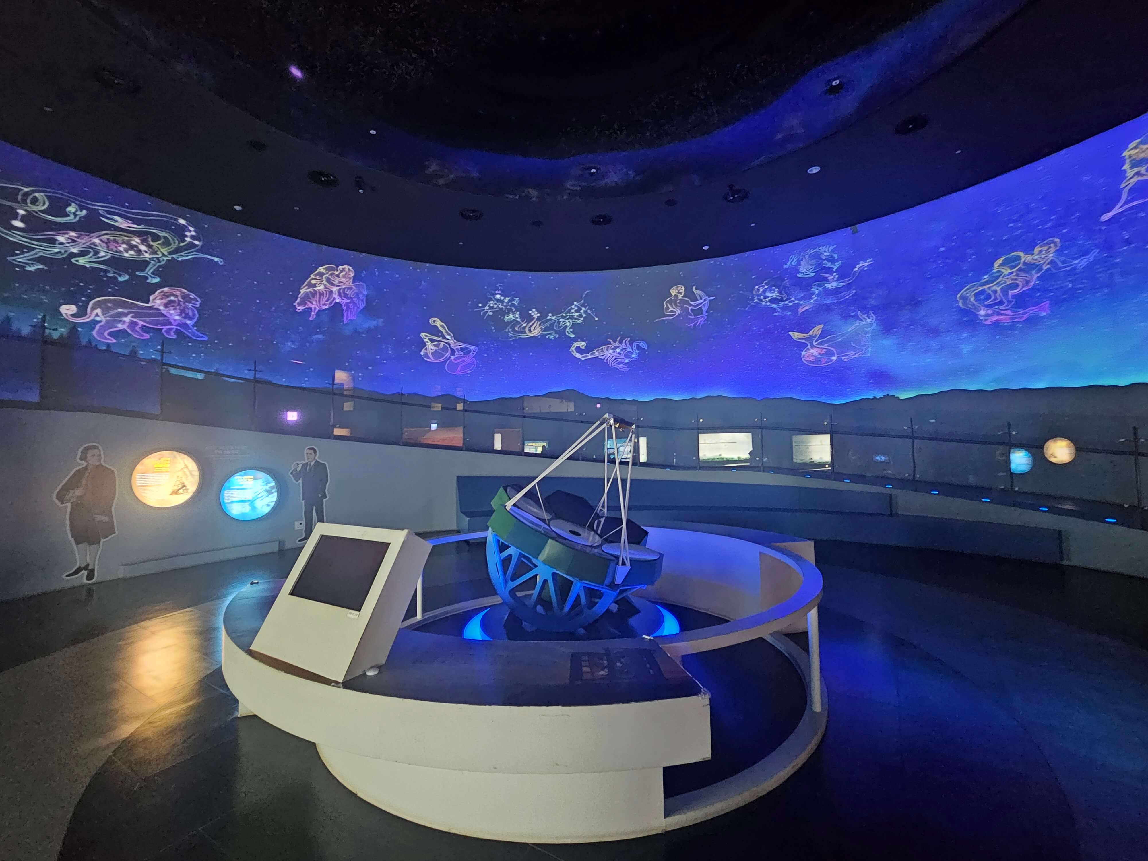 첨성대 모형이 있고 내부의 모습이 전시되어 유심히 보게 됩니다. 동그란 전시실 벽에 별자리들이 수놓아져 밤하늘의 별자리를 연상케 합니다. 각자의 생일의 별자리를 찾아볼 수 도 있습니다.