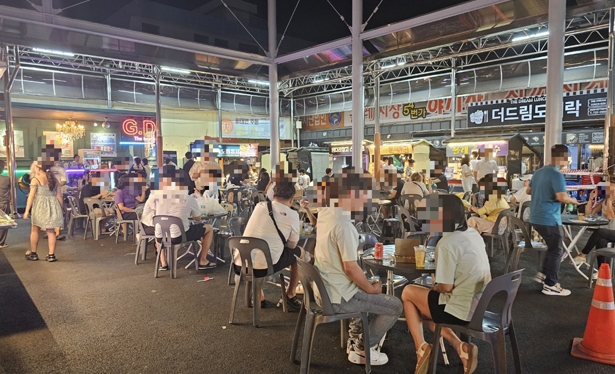여기가 진정 야시장의 끝판왕입니다. 산해진미가 가득하고 젊음과 낭만이 있는 올레 54번가 야시장입니다. 삼삼오오 모여앉아 각자 취향의 음식을 두고 이야기꽃을 피웁니다. 시끌벅적한 야시장의 진풍경입니다.