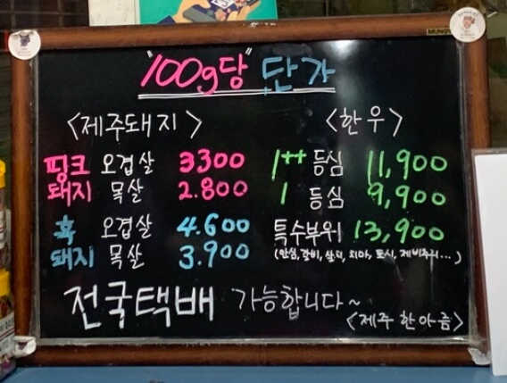 전국에서 소문난 집이라고 간판에 쓰여있는 정육 마트입니다. 전국 택배도 가능한 이 집은 놀랄만한 가성비를 자랑합니다. 100g당 단가가 적혀 있는데 계산해 보면 제주 흑돼지 오겹살이 1근(600g)에 27,600원입니다. 제주뿐만 아니라 대한민국 어디에서도 만나기 힘든 가격으로 제주 흑돼지 바베큐를 먹을 수 있을 것 같아 선정한 곳입니다. 흑돼지뿐만 아니라 투뿔 한우 소고기 가격도 매우 착하고 수려한 마블링을 겸비하였다고 하니 소고기와 돼지고기를 적당히 구매하여 숙소에서 바베큐를 즐길 예정입니다.