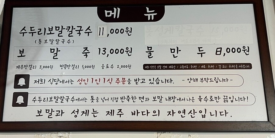 수두리 보말칼국수 11,000 / 보말죽 13,000 / 물만두 8,000