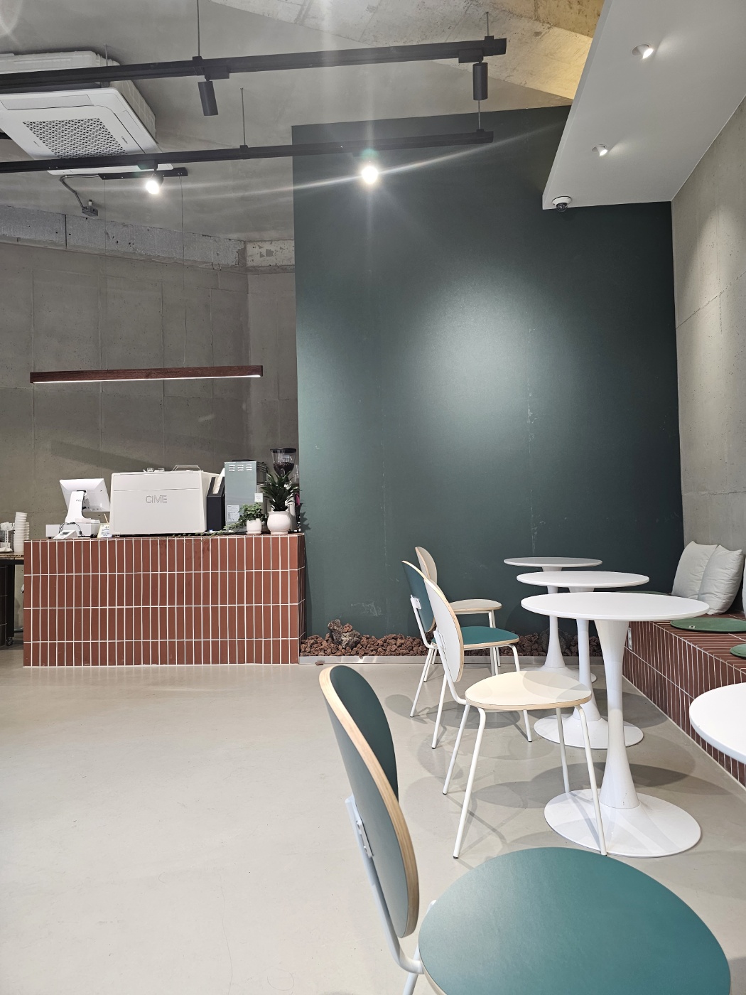 일단 처음 반기는 외관이 건축가가 신경 써서 지은 듯한 비주얼로 군더더기 없는 깔끔한 디자인입니다. 문을 비스듬히 내어 유니크하고 멋스러워 시선을 사로잡습니다. 하늘과 자연과 건물이 어우러져 더욱 돋보이는 감각적 외관을 자랑합니다. 주차장이 넓어 초보 운전자도 쉽게 주차 가능할 듯합니다. 입구에 들어서면 스마일 발 매트가 반겨줍니다. 어서 오세요~^^ 내부는 전체적으로 밝은 그레이와 진초록, 벽돌색이 어우러져 조화롭고 아늑해 보입니다. 천장은 오픈형이라 개방감이 있고 공간을 더 넓어 보이게 합니다. 내부에는 중정이 있고 나무가 심어져 있습니다. 그곳으로 햇살이 잔잔하게 들어와 자연스러운 빛과 그림자를 만들어줍니다. 곳곳에 스피커, 스탠드, 돌 등 깨알 같은 소품들이 센스가 넘칩니다. 붙박이 의자 밑으로 자리마다 콘센트가 위치해 있습니다. 휴대폰 충전 및 노트북 충전 가능합니다~화장실도 깔끔해서 이용하는데 불편함이 없습니다. 전체적으로 외부과 내부 모두 깔끔하면서도 감각적인 가로수길 느낌의 스타일 입니다. 개인적으로 이런 느낌적인 느낌 너무 좋습니다~^^