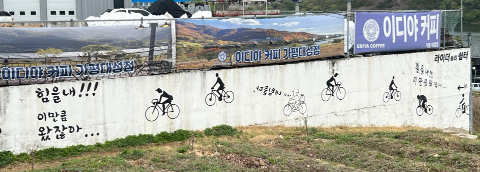 외부 테라스입니다. 매장의 후면 문을 열고 나가면 바로 북한강이 보입니다. 외부에도 테이블, 의자가 넉넉히 배치되어 있어 편안하게 북한강 뷰를 감상하며 커피 한 잔의 여유를 즐길 수 있습니다. 좌측으로는 수상 레저를 즐길 수 있는 곳도 보입니다. 여름에는 시원하게 수상 레저도 감상할 수 있겠네요~ 강변으로 자전거 도로가 있고 자전거도로에서 진입로가 있어 라이더 분들도 쉬어갈 수 있는 카페 입니다. 사이드 담장에는 라이더 분들을 모시는 귀여운 문구와 그림들이 깨알같이 매장 홍보를 돕고 있습니다. 자전거 조형물도 인상적입니다.