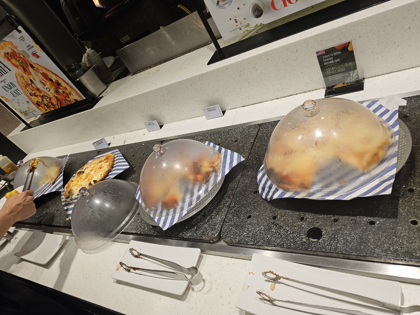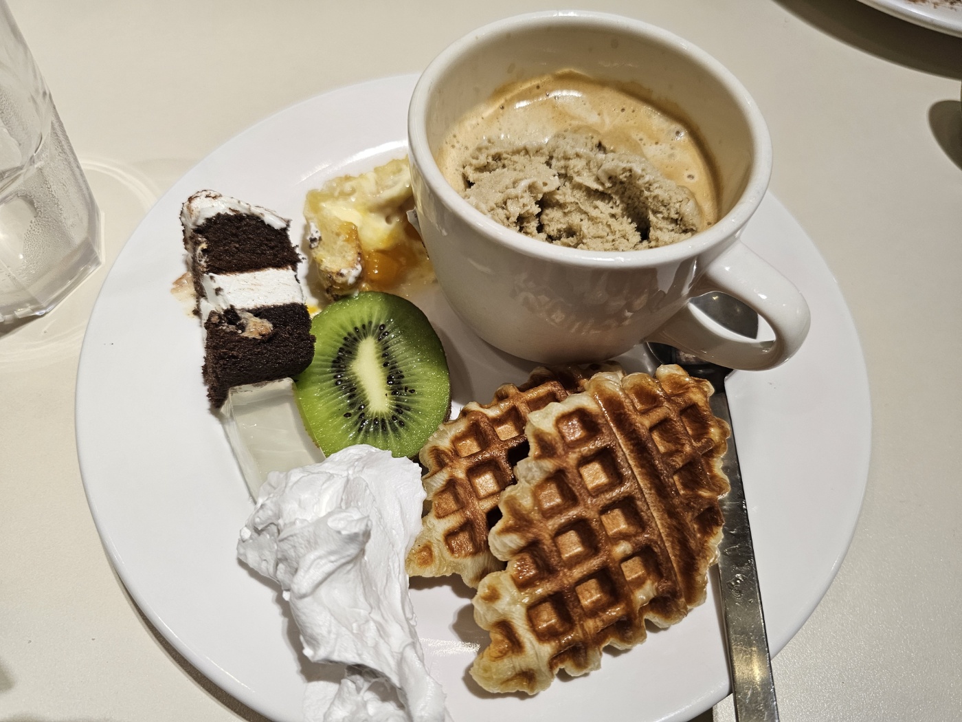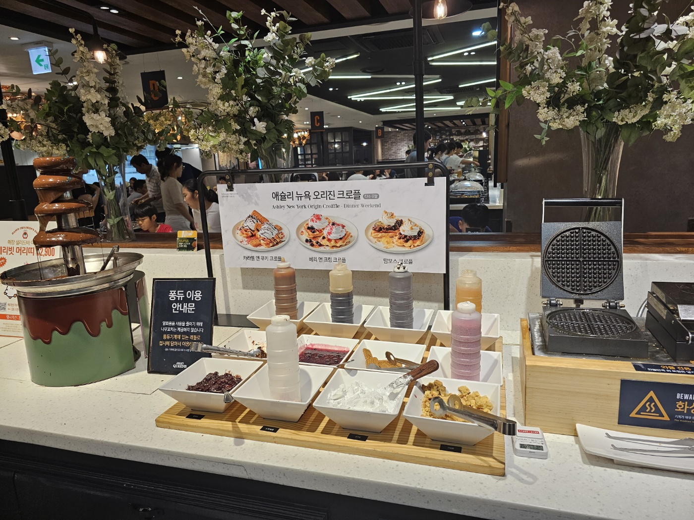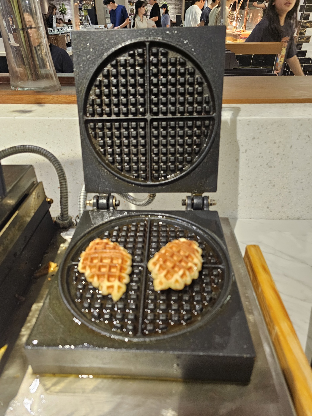 배가 고파서 앉지도 않고 소지품만 대충 내려놓은 뒤 접시를 집어 들었습니다. 슥 눈으로 스캔하고 빠르게 두 접시를 담았습니다. '조금씩 모든 메뉴를 맛보자'를 목표로 호기롭게 시작했습니다. 접시가 크지 않아서 많이 담을 수가 없어 아쉬워하며 하나씩 담아봅니다. 배가 많이 고팠지만 하나씩 다 맛보고 싶었습니다. 하지만 세 접시 정도 먹으니 배가 불러 더 이상 못 먹을 듯합니다. 다양하게 조금씩 담았는데도 다 담지 못할 만큼 메뉴가 많았습니다. 대체로 간이 세고 매콤 달콤한 자극적인 맛의 음식이 많아 음료나 물을 자꾸 찾게 됩니다. 그래서 더 빨리 배가 불러오는 듯했습니다. 세 접시까지 먹고 포기~^^ 주말이라 사람이 많아 회전율이 좋습니다. 모든 음식이 식지 않고 따뜻했던 것 같습니다. 배가 불러도 디저트는 먹어야 합니다. 왼쪽에서 와플을 굽고 오른쪽에서 크로플을 구워보았습니다. 아들이 초코도 발라줍니다. 아들아~ 엄마는 초코를 좋아하지 않는단다~ ㅎㅎㅎ 그래서인지 크로플이 훨씬 맛있습니다~ 에스프레소에 밤맛 아이스크림을 넣어 아포카토도 먹어보았습니다. 뷔페에 갔다면 이건 꼭 먹어야 합니다~^^