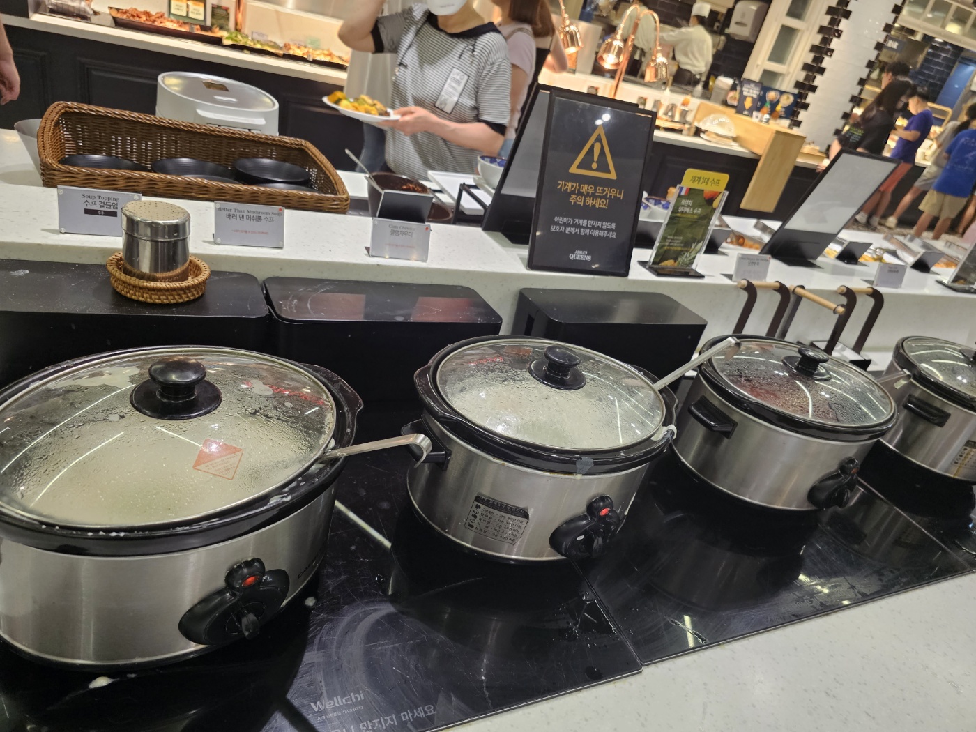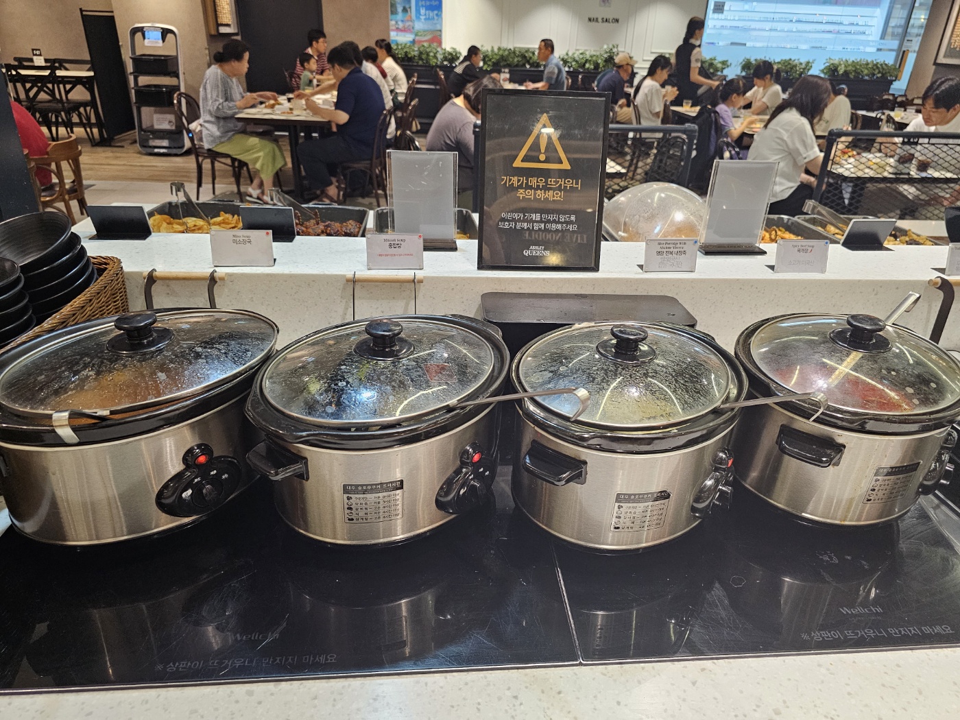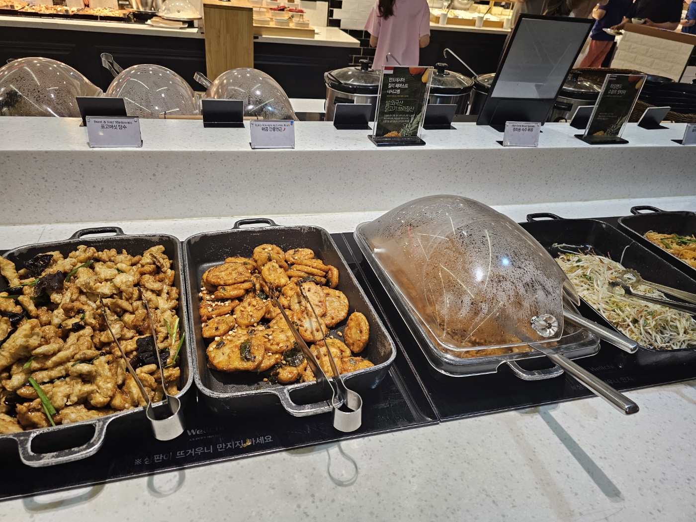 한식 존에는 4개지의 탕 종류와 잡채, 백순대 볶음, 두부김치, 스파이시 쫄면 등 한국 사람 토종 입맛을 사로잡을 메뉴들이 즐비해 있습니다. 깍두기, 연근 같은 밑반찬도 있습니다. 남녀노소 즐길 수 있는 코너입니다.