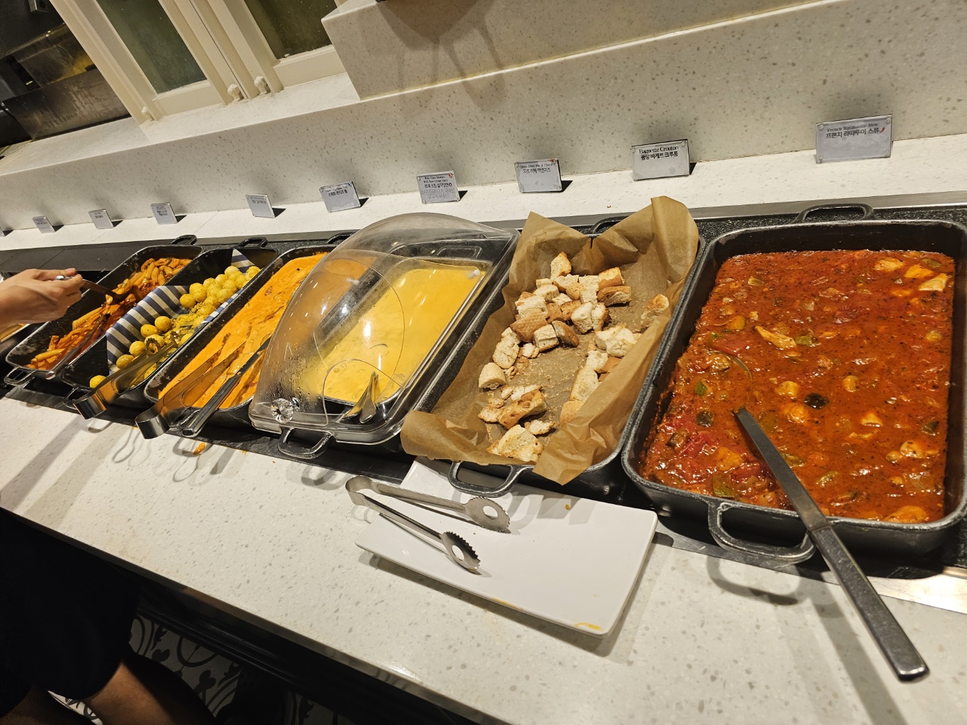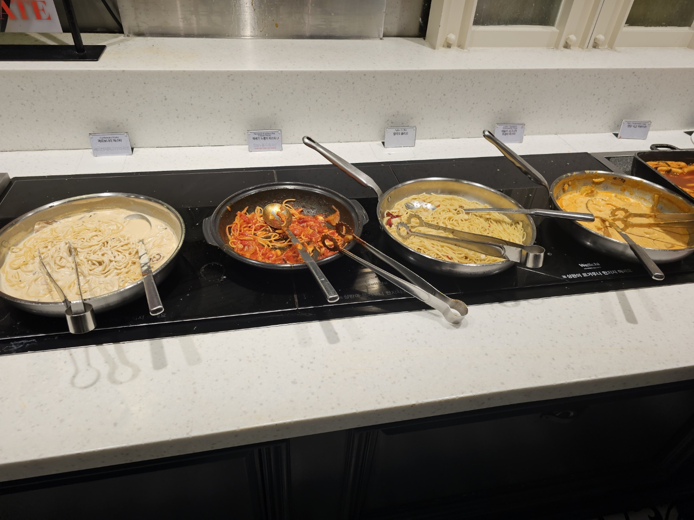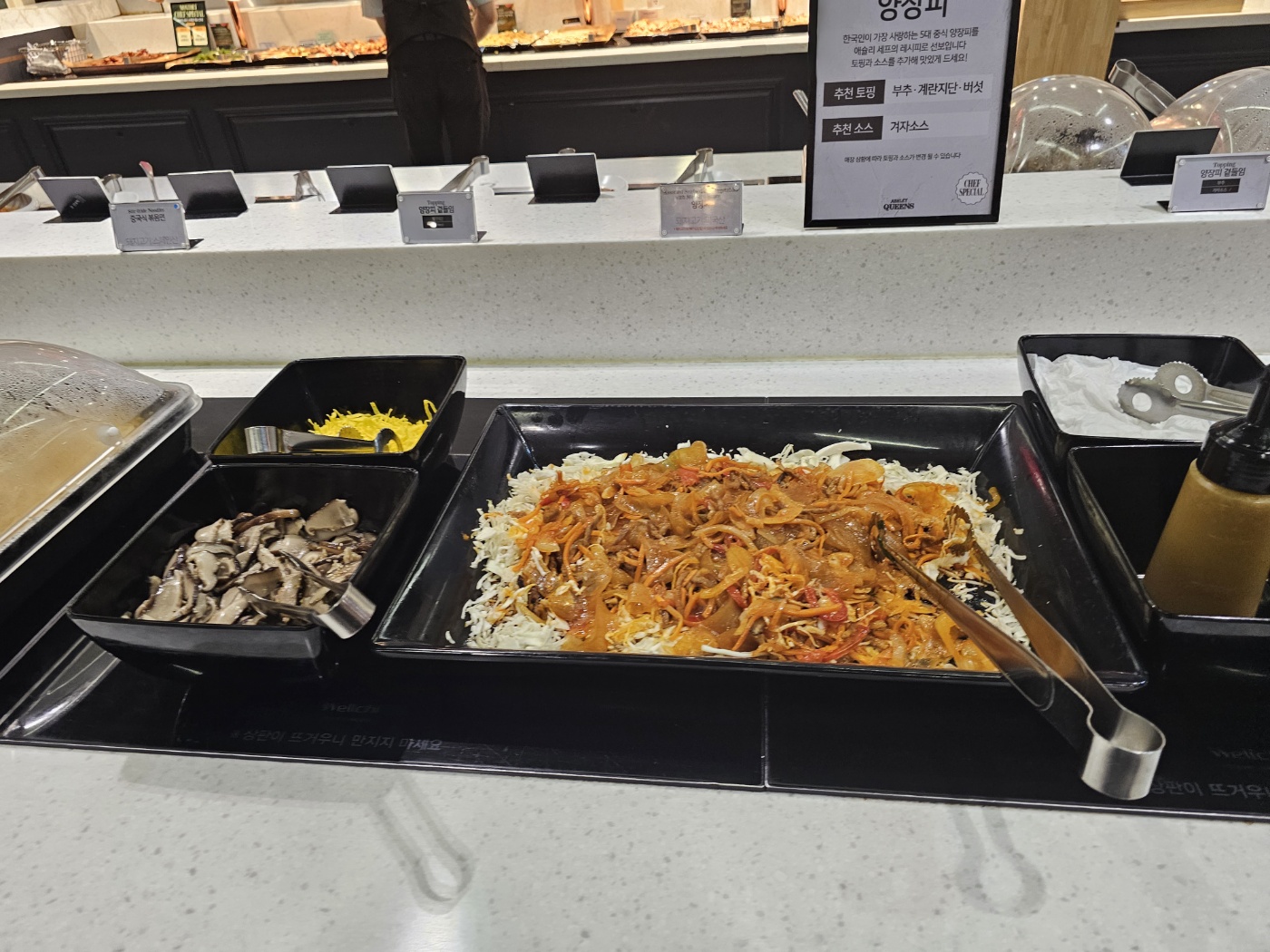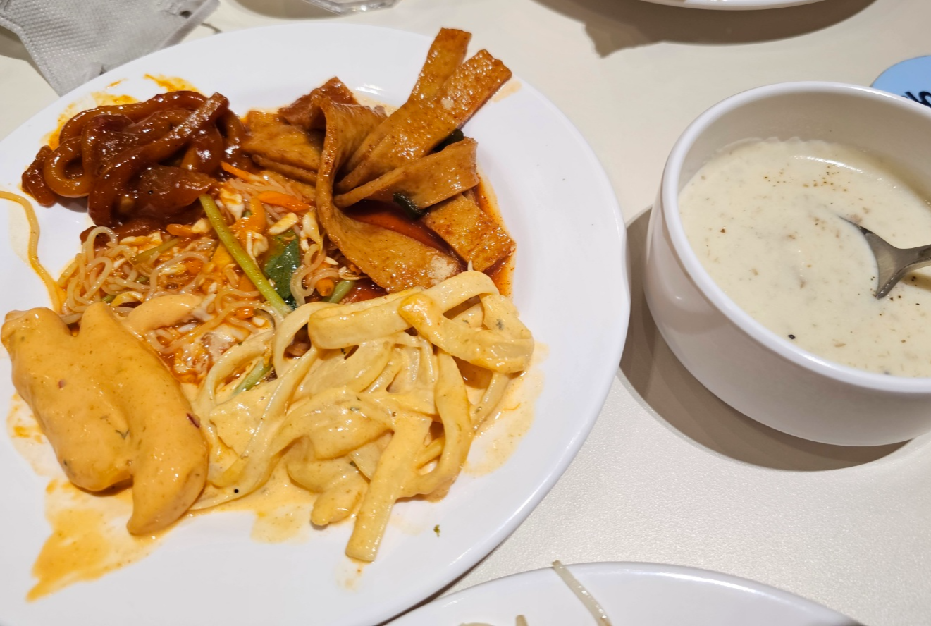 한식 존에는 4개지의 탕 종류와 잡채, 백순대 볶음, 두부김치, 스파이시 쫄면 등 한국 사람 토종 입맛을 사로잡을 메뉴들이 즐비해 있습니다. 깍두기, 연근 같은 밑반찬도 있습니다. 남녀노소 즐길 수 있는 코너입니다.