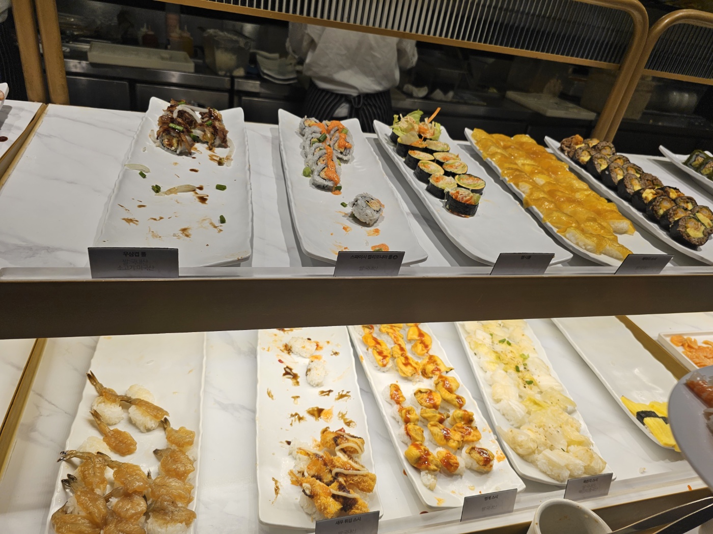 연어 스시 / 아보카도 명란 군함 / 타코 와사비 군함 / 한치 스시 / 훈제 오리 스시 / 게살 스시 / 명란 감태 스시 / 명란 마요 한치 스시 / 초새우 스시 / 간장 새우 스시 / 새우튀김 스시 / 가리비 스시 / 멍게 스시 / 헬시롤 / 해파리 스시 / 슈림프 소바 마끼 / 묵은지 스시 / 계란 스시 / 장어 스시 / 우삼겹 롤 / 스파이시 캘리포니아 롤 / 유부초밥 / 훈제연어 등