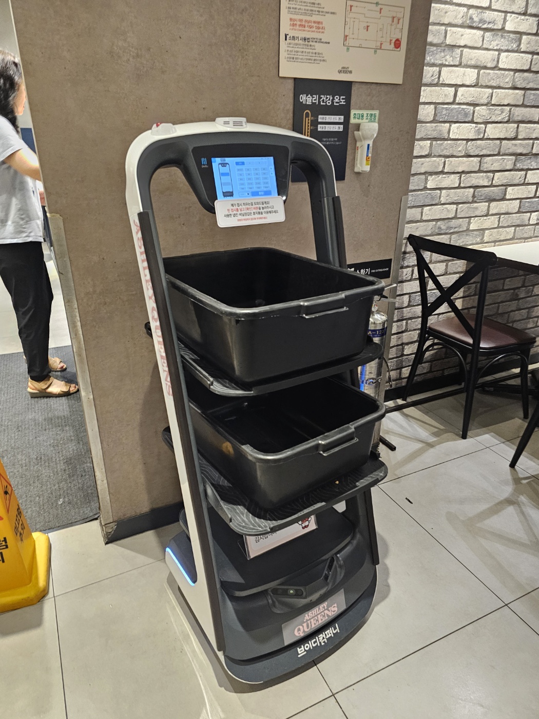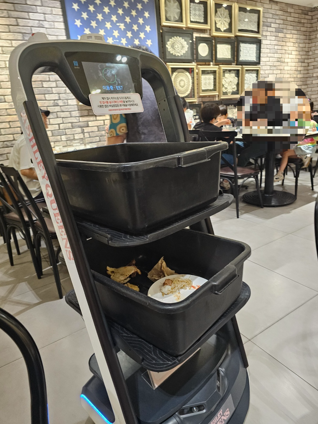 그리고 우리의 눈길을 끌었던 빈 접시 수거 로봇!! 저기 기둥 옆에 얌전히 있다가 테이블에 설치되어 있는 벨을 누르면 우리 테이블 근처로 조심조심 장애물을 피해 달려옵니다. 빕 접시를 넣고 [확인] 버튼을 누르면 다시 제자리로 돌아갑니다. 덕분에 직원들이 빈 그릇을 들고 다니는 모습은 볼 수 없습니다. 로봇들이 열일을 하고 있어 아이들이 신기해 하고 빈 접시도 스스로 치웁니다~ 편리하긴 하지만 일자리 감소를 생각하니 씁쓸하기도 합니다.