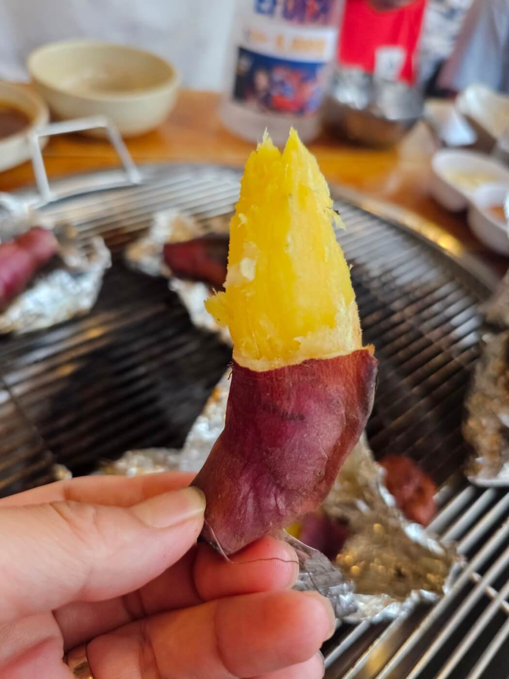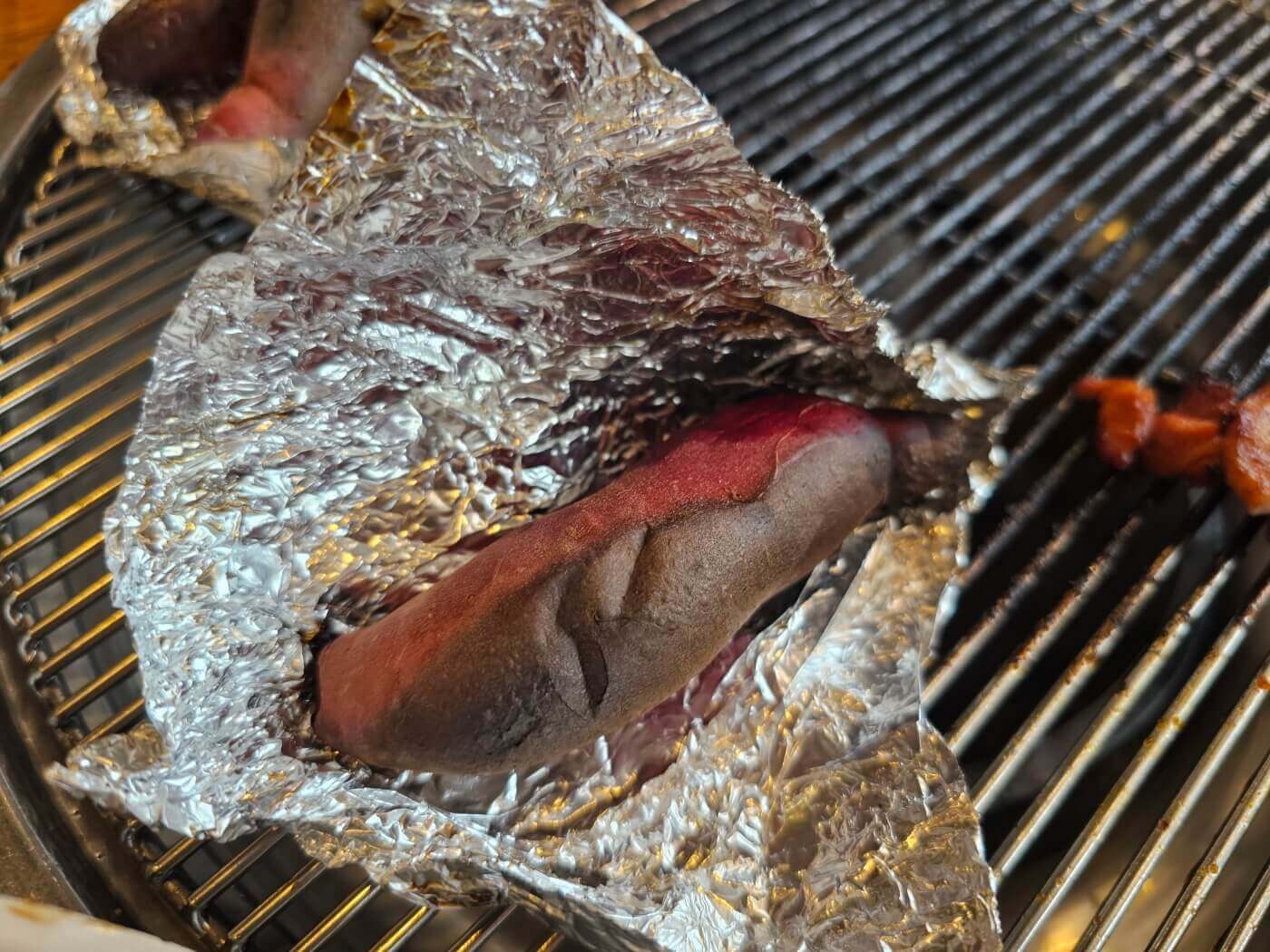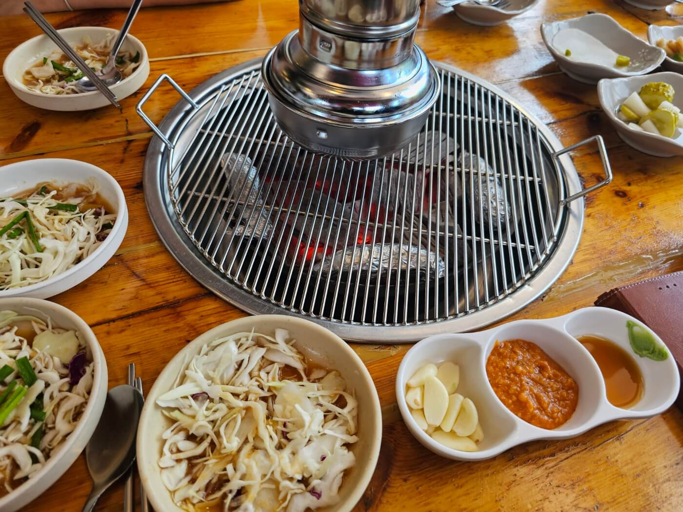 처음 생오리 한 마리와 진흙구이를 주문하였습니다. 미리 예약을 하지 않은 터라 2시간 정도 기다려야 한다고 합니다. 미리 전화해서 주문하시길 추천드립니다. 저희는 먹고 싶다는 불굴의 의지로 주문하고 진흙구이가 나올 때까지 천천히 식사를 즐기기로 했습니다. 숯불과 밑반찬을 셋팅 해 주셨습니다. 숯불 사이드로 은박에 쌓인 후식 고구마들이 같이 들어옵니다. 숯불 위에 고기들은 참으로 아름답습니다.