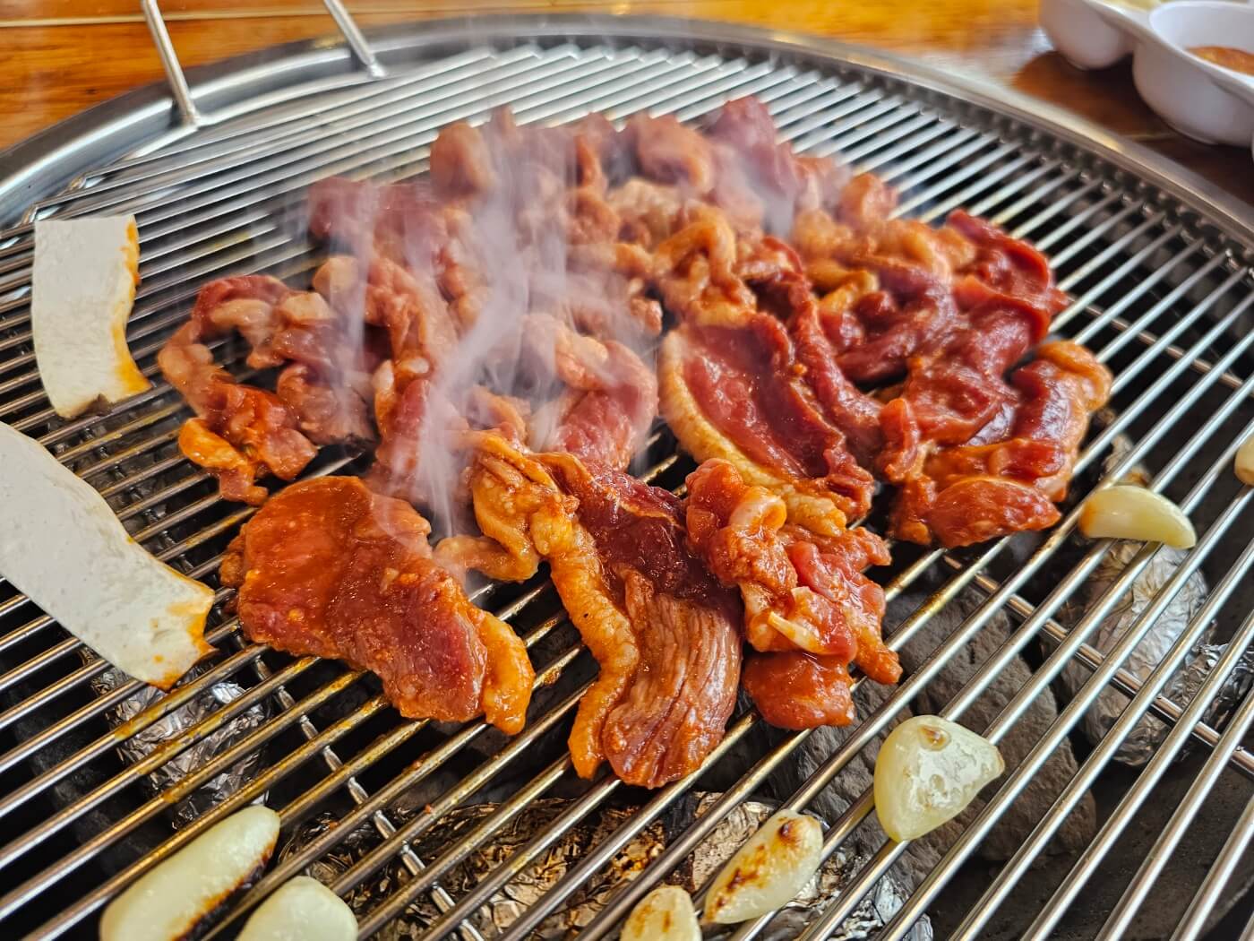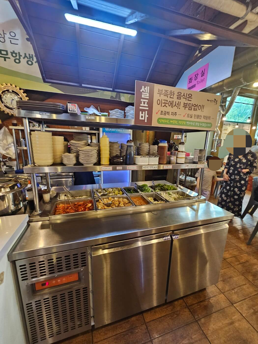 셀프바에서 부족한 반찬은 가져다 먹을 수 있습니다. 기본 상차림에 나오지 않는 반찬들도 셀프바에 있으니 꼭 확인해서 원하시는 반찬을 알차게 드시기 바랍니다. 깻잎, 오이고추, 된장국, 동치미, 여러 가지 소스 등 기본 상차림에는 없는 아이템들이 있습니다. 식후에 즐길 수 있는 커피도 취향별로 골라 먹을 수 있게 준비되어 있고, 숯불구이인 만큼 베인 숯불향을 없애줄 페브리즈도 비치되어 있습니다. 센스만점입니다.