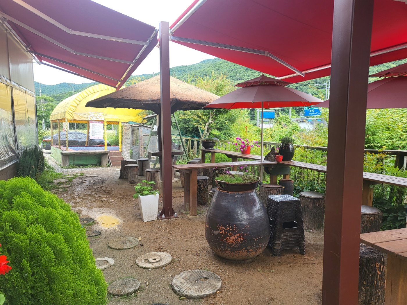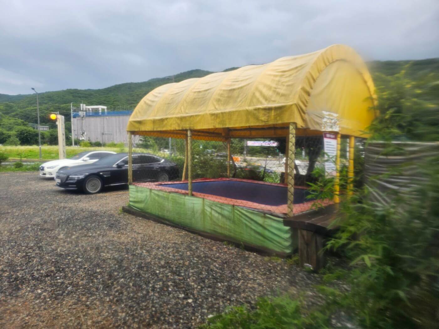 1층 야외에 유아 코인 자동차, 게임기, 뽑기 등 즐길 거리가 조금 있습니다. 넓은 마당에 방방장도 있어서 아이들이 뛰어놀 수 있습니다. 식당에 가면 휴대폰만 보기 바쁜 아이들인데 덕분에 잠시 자연 속에서 뛰어놀 수 있었습니다.
