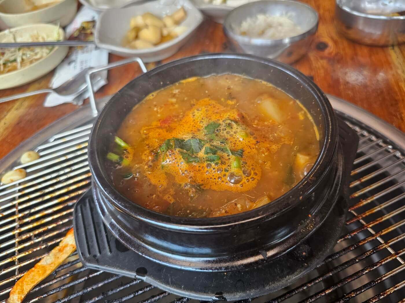 진흙구이가 나오기까지 약간의 공백이 있었습니다. 이슬과 함께하고 계신 남자분들 안주가 없습니다. 뚝배기 오리탕을 시켜 공백시간을 채워줍니다. 오리탕은 진한 국물과 들깨가루, 깻잎 향이 가득한 소주를 부르는 맛입니다. 차 때문에 금주중인 저에게는 가혹한 맛이었습니다. 다음에 가면 저 오리탕을 꼭 포장해오고 싶습니다.
