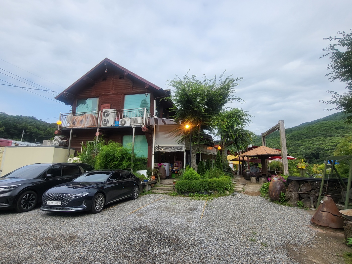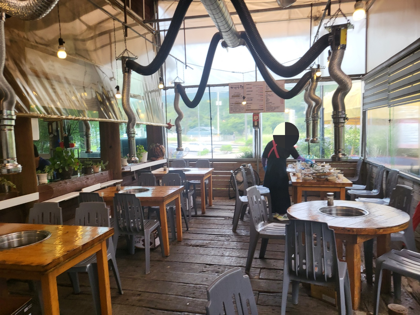 내부는 고급스럽지는 않지만 왠지 친숙한느낌 입니다. 건물이 나무로 지어졌고 내부 마감도 나무로 되어있어 고즈넉한 분위기입니다. 안팎으로 초록 초록, 푸릇푸릇합니다. 멀리 보이는 청계산 뷰부터 야외에 풀들과 꽃들, 내부에 화분들까지 피톤치드를 마구 뽑아내주어 자연 속에 있는듯한 느낌입니다. 1층에는 넓은 홀 안의 테이블과 야외가 훤히 보이는 야장 느낌의 테이블도 몇 개 있습니다. 야외에도 테이블이 있습니다. 2층도 있는데 홀이 넓고 1층보다 좌석이 더 많은 듯합니다. 저희는 비도 내리고 하니 1층 야장 느낌의 자리에서 식사하였습니다,