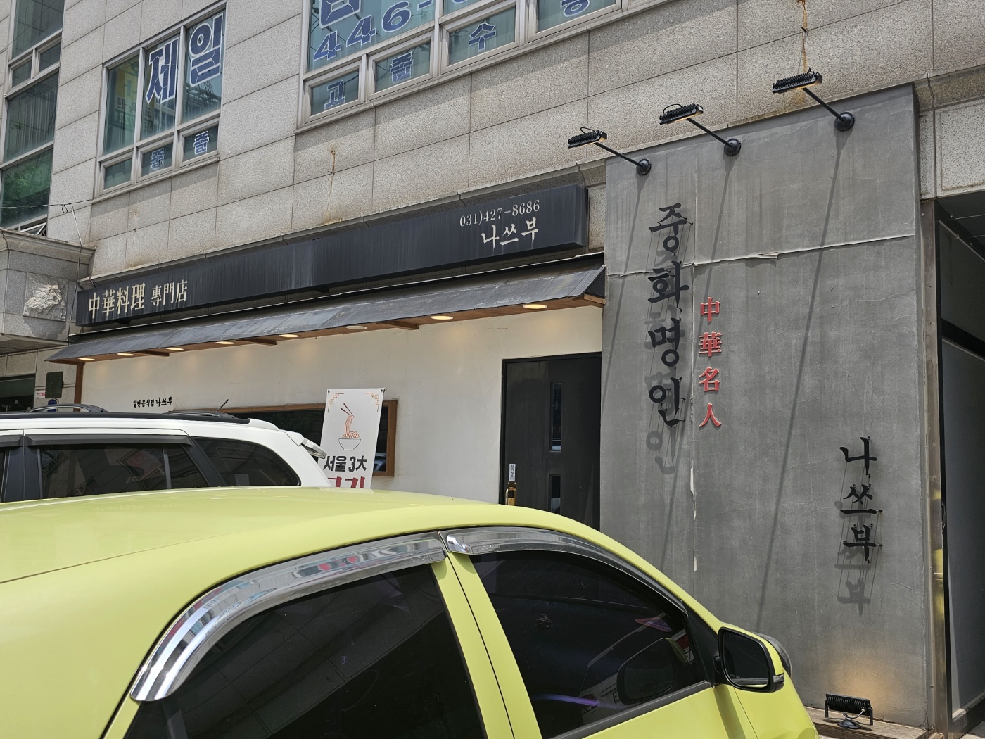 외부는 중국집 스럽지 않습니다. 안양에 오래 살았던 사람들도 맛집에 관심이 없다면 여기 중국집이 있는지 잘 모릅니다. 블랙, 화이트, 그레이톤의 색감에서, 간판의 여백에서 고급스러움이 느껴집니다. 외부에 가로로 길게 난 창이 나 있어 고급 일식집 같은 느낌도 살짝 납니다. 넓은 대리석 면에 중화명인, 나쑤부 라고 쓰여있습니다. 절제된 여백과 상, 하부의 조명으로 명인의 자존심을 표현한 듯 합니다. 오래되어 이음매가 다 터져있습니다. 세월의 흔적이 느껴지는만큼 장수한 맛집임을 의미합니다.