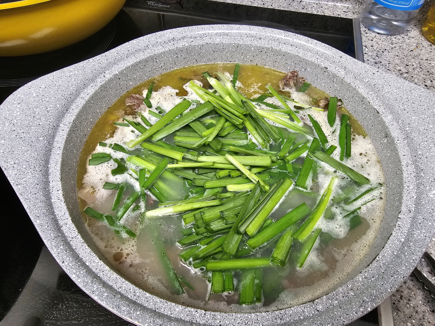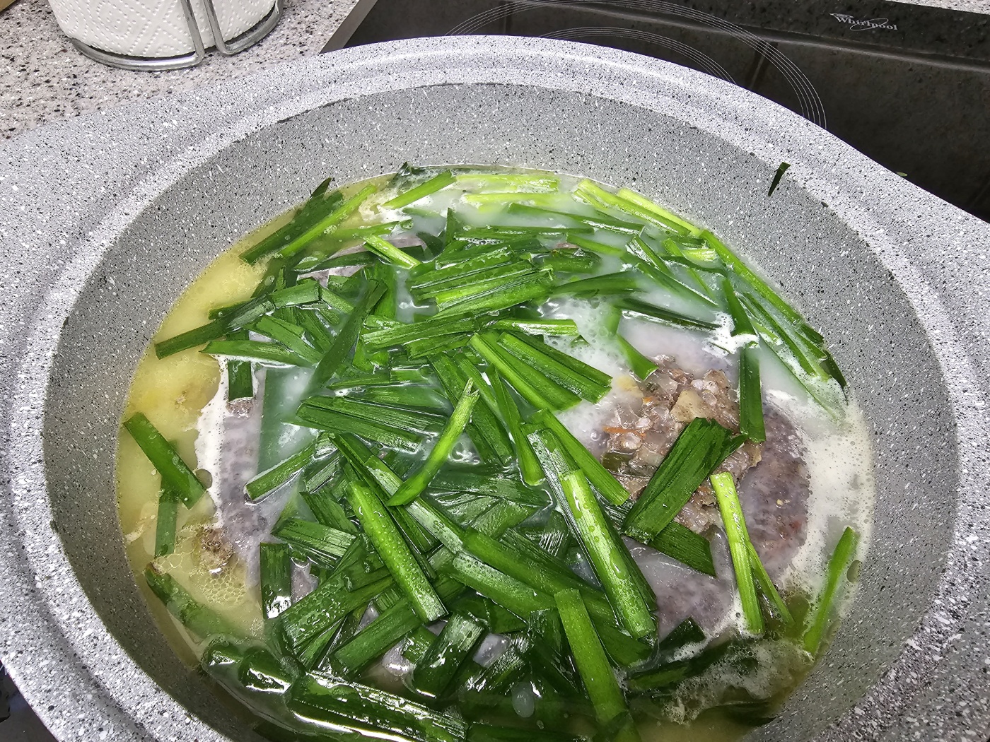 그래서 한 번 더 도전해 보았습니다. 이번에는 순대를 썰지 않고 그대로 넣어줍니다. 위에 곰탕 국물을 붓고 끓였습니다. 부추를 얹어주고 한소끔 더 끓여준 후 순대는 먹기 전 가위로 잘라주었습니다. 이렇게 하니 온전한 순대의 형태를 잃지 않았습니다. 그리고 도마와 칼과 잔 부스러기도 없었습니다. 아래 방법을 추천드립니다.