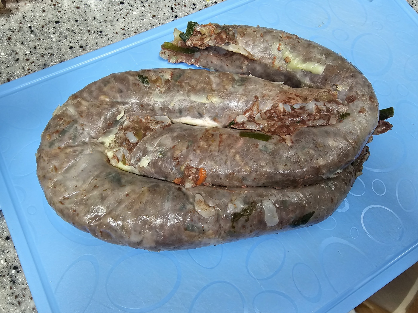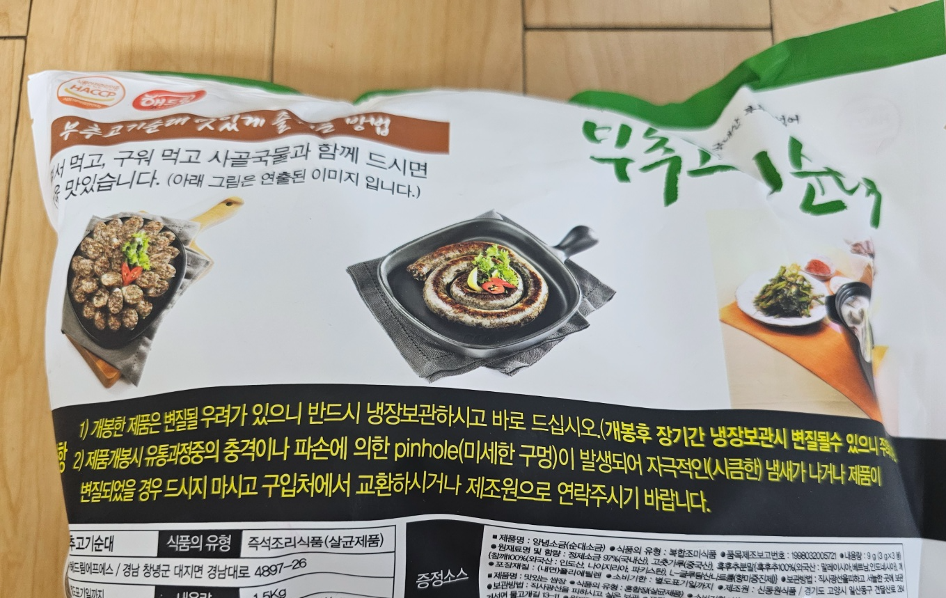 순대 재료로는 양배추, 돼지고기, 돈소창, 부추, 건면, 이산화황, 곡류가공품, 대파, 양파, 돈혈, 당근, 채종유, 전분, 된장, 마늘, 전란, 두류가공품, 복합조미식품, 들깨가루, 생강, 청양고추, 두류가공품, 정제염, L-글루탐산나트륨, 후추가 있네요~고기 야채 이외에도 여러 가지 야채가 들어갑니다. 돼지고기와 부추, 양배추 등 주재료는 국내산입니다. 재료 좋습니다~^^