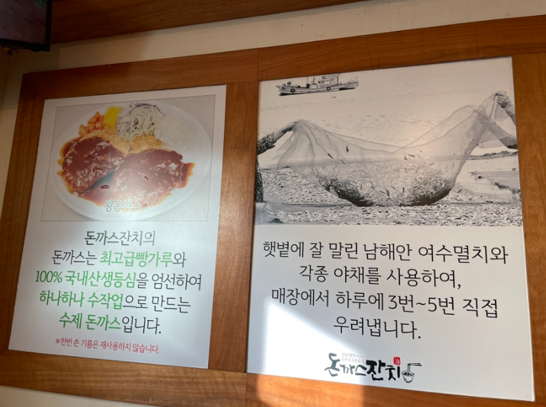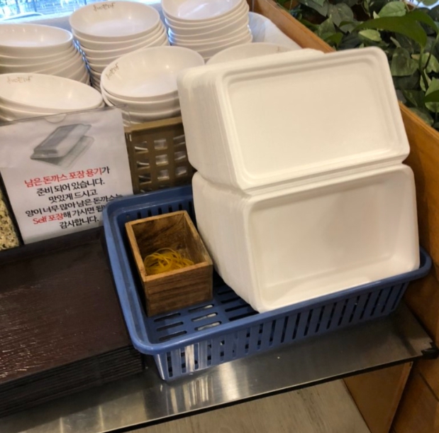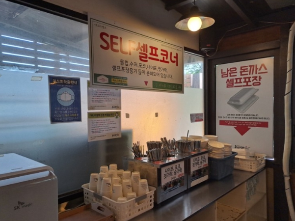 내부는 평범한 식당의 모습 입니다. 그래도 외관의 연식보다는 훨씬 깔끔해 보이는 내부의 모습입니다. 화이트와 우드의 사이좋은 조합은 언제나 옳습니다. 무난하게 어울리니까요~^^ 오픈천장으로 공간이 더 높고 넓어보이는 개방감을 줍니다. 천장에 갓등과 각종 조명들, 크리스마스 장식볼까지 달려 있습니다~^^ 내부가 꽤 넓직하고 2층도 있습니다. 혼밥에서 단체까지 이용가능하며 계산대 왼편으로는 단체 예약도 받으신다고 합니다. 벽에는 식당의 자부심 포스터가 있습니다~ 우와~!! TV에서는 전참시가 방영중이라 음식이 나오길 기다리면서 계속 보게 됩니다. 볼수록 기대가 커지게 하네요~ㅎㅎ 한편에는 셀프코너가 있고 정수기, 컵, 나이프, 포크, 젓가락, 숟가락, 앞접시가 있습니다. 여기서 눈여겨볼점... 남은 돈까스 셀프포장 코너가 있습니다. '양이 너무 많아 남은 돈까스는 Self 포장해 가시면 됩니다. 라고 써있습니다.' 얼마나 많이 주기에 포장용기까지 셋팅되어 있을까? 돈까스를 시켜보고 싶은 마음을 굴뚝으로 만드는 셀프코너 입니다.