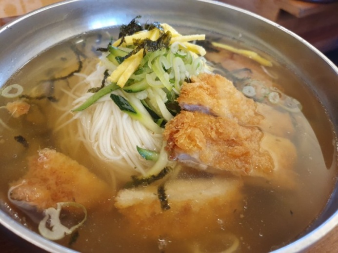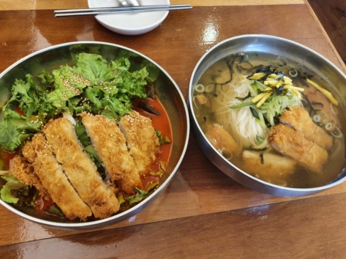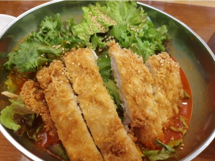 마지막으로 돈비국수는 상추, 오이, 양배추가 들어있어 야채들의 아삭함을 느낄 수 있는 새콤달콤한 맛이었습니다. 하지만 평소 비빔국수, 비빔냉면을 즐겨먹는 저에게는 뭔가 2프로 부족한 맛이었습니다. 아삭한 야채들의 식감은 좋았지만 양념이 자극적이지 않아서 그랬던 것 같습니다. 지극히 개인취향...^^ 돈가스를 양념에 찍어 먹으면 또 새로운 맛입니다.