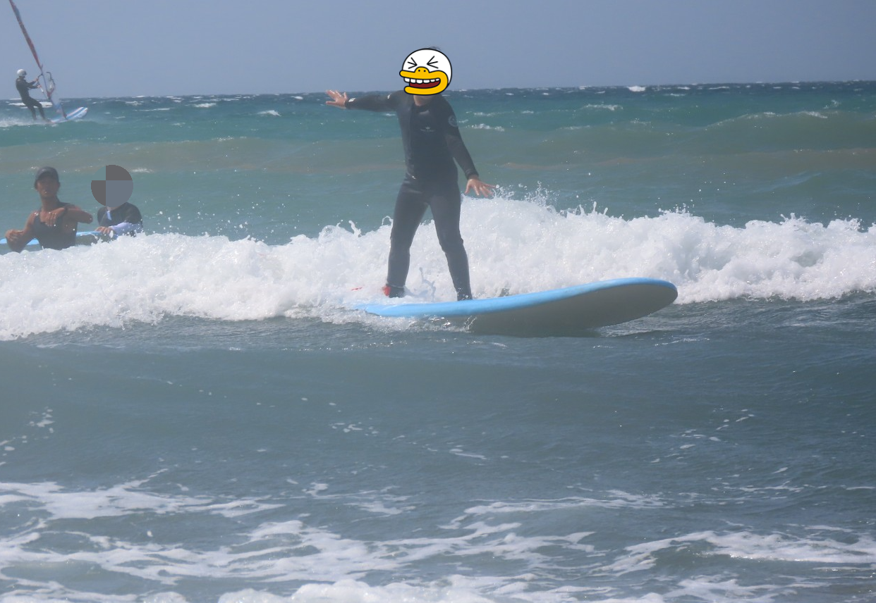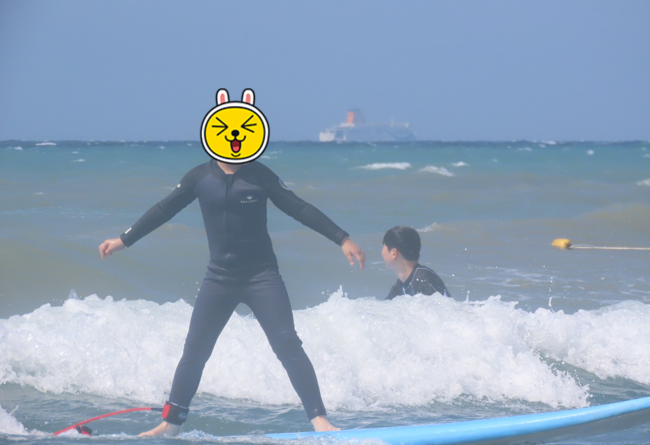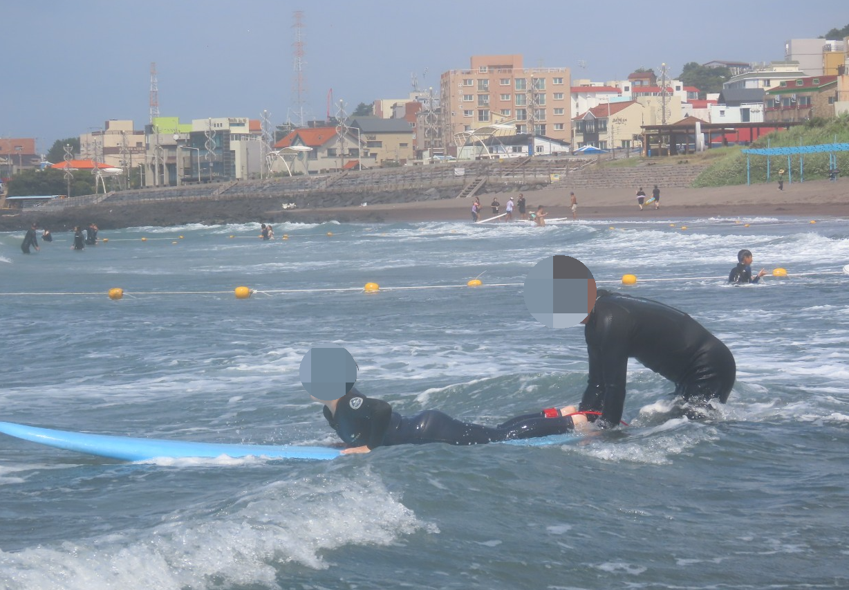 처음으로 슈트를 입어보았습니다. 이렇게 민망할 줄 알았으면 미리 다이어트를 좀 하고 갈걸 그랬습니다. 날씨가 무더운 여름이라면 개인 래새가드를 입는 것도 좋겠습니다. 하지만 괜찮습니다. 어차피 한번 보고 말 사람들이니까요~^^ 이 날 파도가 세서 처음엔 바다로 나아가는 것조차 힘겨웠습니다. 나의 의지와는 다른 방향으로 가다 보니 강사님께 도달하는 것도 쉽지가 않았습니다. 아빠는 아들을 서핑보드에 태우고 강사님께 데려다주느라 본인은 몇 번 타지 못한 듯합니다. 역시 40대 체력은 금방 바닥이 납니다. 잠시 쉬는 시간이 있었고 다시 마음을 다잡고 바다로 나아가 봅니다. 결국 마지막에 저도 해냈습니다. 끝까지 실패할 것만 같았는데 이게 되다니 너무 신이 납니다.