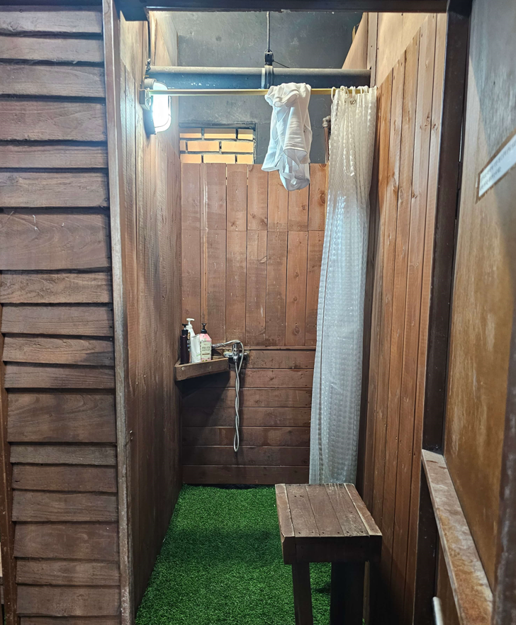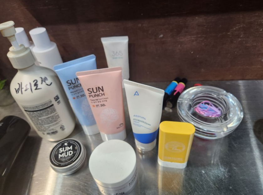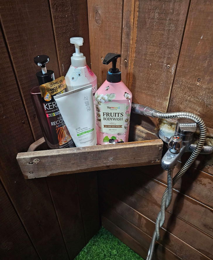 샤워시설과 비치되어 있는 용품들 입니다. 개인 샤워실에서 편안하게 샤워가능하고 따뜻한 물이 빵빵하게 나옵니다. 샴푸, 린스, 바디워시, 폼클렌저도 있습니다. 바구니에 개인 수건이 들어있고 소지품을 보관할 수 있습니다. 거울 앞에는 각가지 선크림과 바디로션, 머리끈까지 갖춰져 있습니다. 정말 없는 것이 없는 범서프입니다.