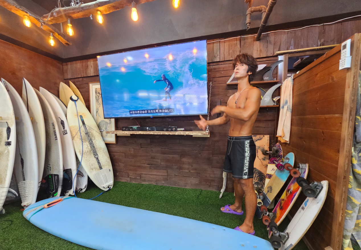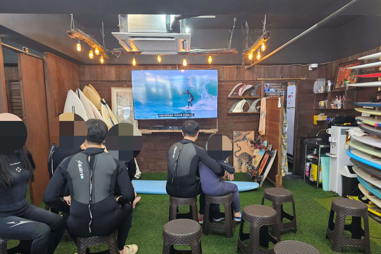 샤워실에서 슈트로 환복을 하고 내부 의자에 앉아서 영상으로 한번, 자칭 멸치라고 하시는 잘생기고 몸 좋으신 강사님이 보드에서 한번 기본 테이크오프 동작과 주의사항에 대해 강습을 해 주십니다. 슬슬 긴장이 되기 시작합니다. 저걸 해낼 수 있을지... 조금씩 떨리기 시작합니다.