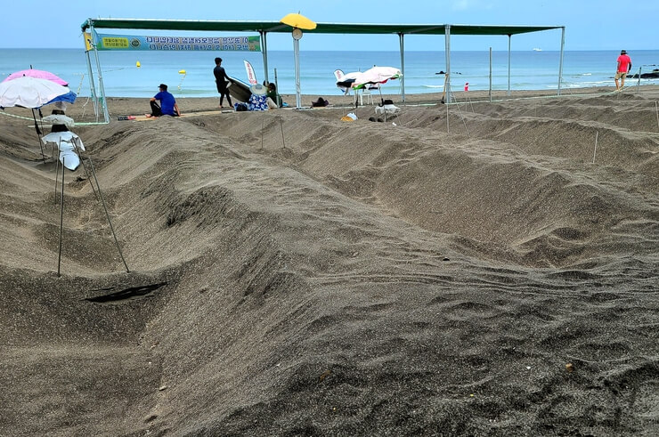 서핑을 즐긴 후 온몸이 아플 것 같은 엄마, 아빠는 신경통, 관절염에 좋다는 검은 모래찜질로 피로를 날려 볼 생각입니다.