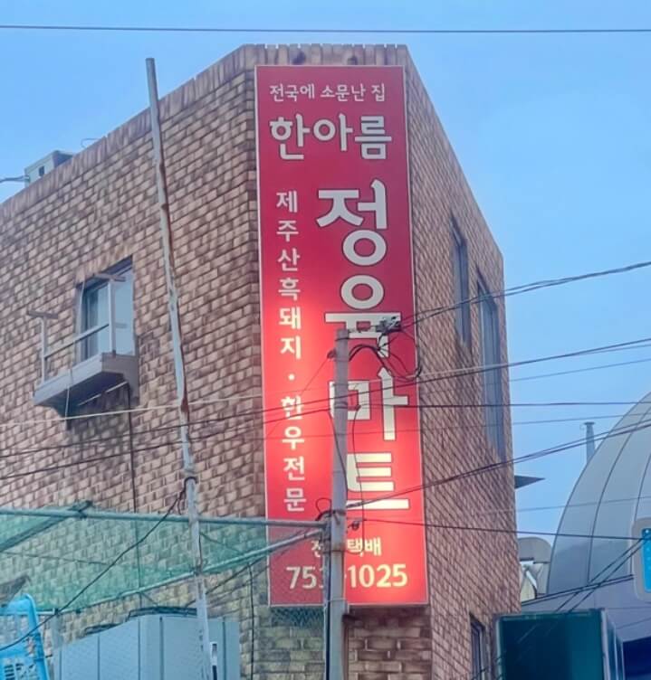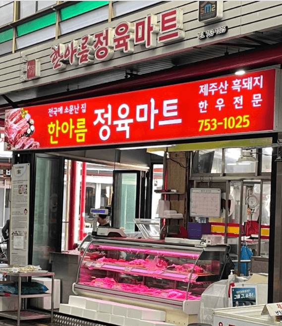 전국에서 소문난 집이라고 간판에 쓰여있는 정육 마트입니다. 전국 택배도 가능한 이 집은 놀랄만한 가성비를 자랑합니다. 100g당 단가가 적혀 있는데 계산해 보면 제주 흑돼지 오겹살이 1근(600g)에 27,600원입니다. 제주뿐만 아니라 대한민국 어디에서도 만나기 힘든 가격으로 제주 흑돼지 바베큐를 먹을 수 있을 것 같아 선정한 곳입니다. 흑돼지뿐만 아니라 투뿔 한우 소고기 가격도 매우 착하고 수려한 마블링을 겸비하였다고 하니 소고기와 돼지고기를 적당히 구매하여 숙소에서 바베큐를 즐길 예정입니다.