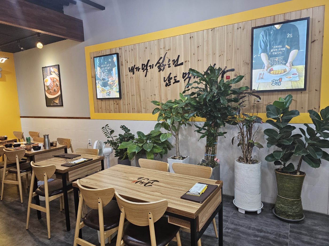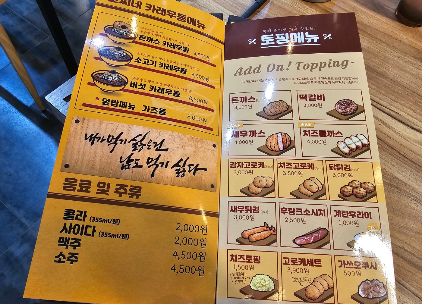 누가봐도 카레집의 느낌으로 노랑 노랑 합니다. 옐로우와 우드를 사용하여 전체적으로 깔끔하고 군더더기 없는 프렌차이즈 인테리어입니다. 중간 중간 조명으로 포인트를 준 듯 합니다. 무난한 인테리어 입니다. 테이블은 혼밥 가능한 2인용 테이블과 가족식사 가능한 4인용 테이블로 구성되어있습니다. '내가 먹기 싫은건 남도 먹기 싫다.' 문구가 인상적입니다.