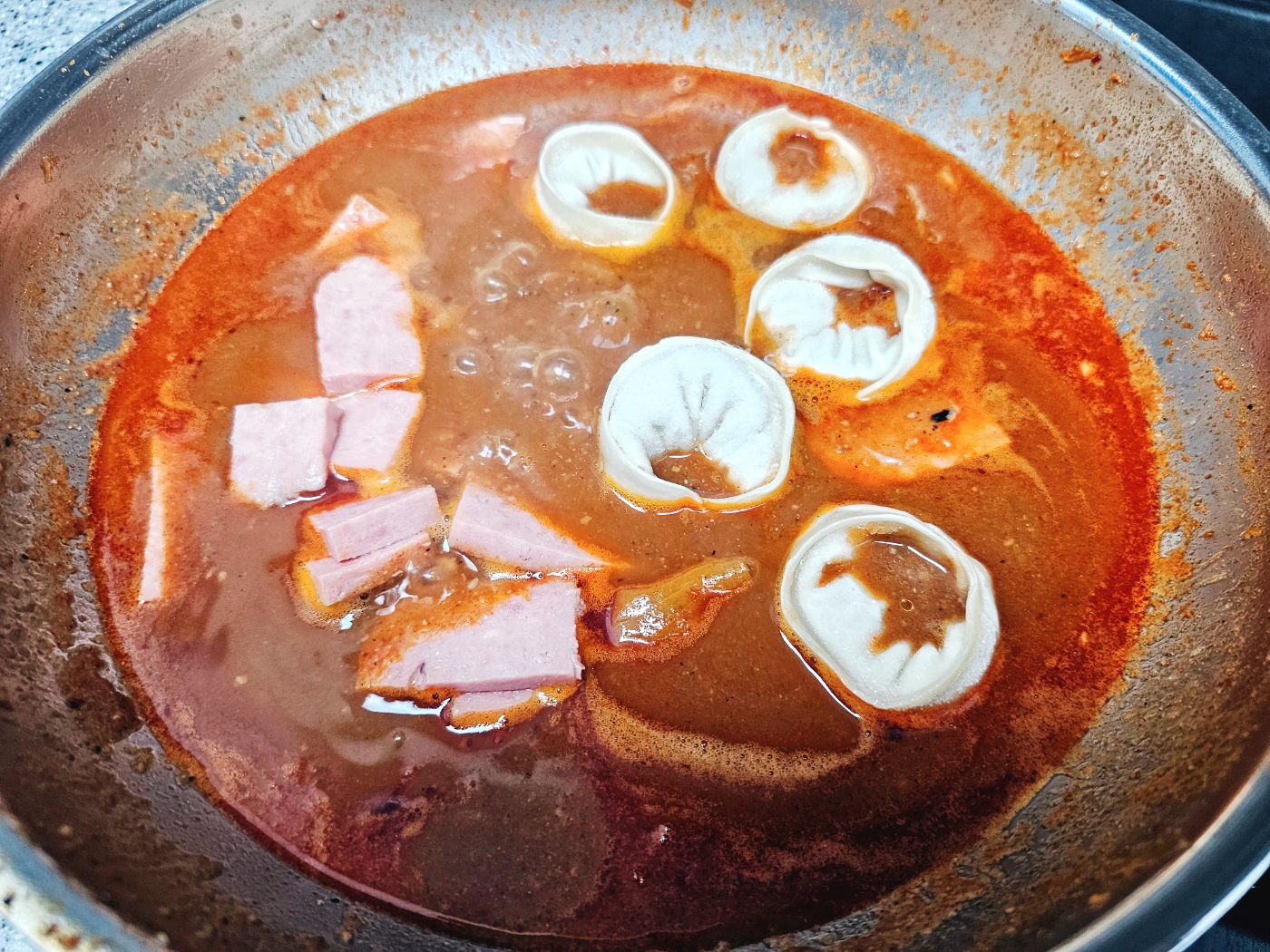 보글보글 끓어오르면 뚜껑을 열고 약불로 줄인 뒤 내용물을 휘휘 저어 섞어줍니다. 물을 넣지 않았는데도 어디선가 물이 나와 국물이 자작해집니다. 3~4분 정도 더 끓여주었습니다. 국물을 한 숟가락 떠서 맛을 보았습니다. 짭니다. 많이 짭니다. 그리고 뭔가 텁텁한 마늘맛이 강하게 올라왔습니다. 제가 뭘 잘못한 걸까요...? 조리방법을 또 읽어봅니다. 분명 시키는 대로 했는데 왜 이렇게 짠 걸까요~ ㅎㅎㅎ '소스를 다 넣지 말았어야 하나' 생각해 봅니다. 물을 400ml 정도 추가로 부어주었습니다. 간은 맞는 것 같은데 마늘맛이 강하고 뭔가 심심해졌습니다. 뭔가 중화시켜줄 재료가 필요해 보였습니다. 저는 설탕 2숟가락(밥숟가락)과 참치 액을 조금 넣고, 베트남 고춧가루 한숟가락을 추가로 넣었습니다. 추가 조미료를 넣고 끓이며 주문을 외웁니다. '맛있어져라, 맛있어져라...' 간이 어느 정도 맞아진 듯합니다. 이제 먹기만 하면 됩니다. 소스를 처음에 한 봉지만 넣고 물을 조금 넣어서 맛을 봐가며 개인 취향에 맞게 소스나 물을 추가해서 조리하시길 추천드립니다.