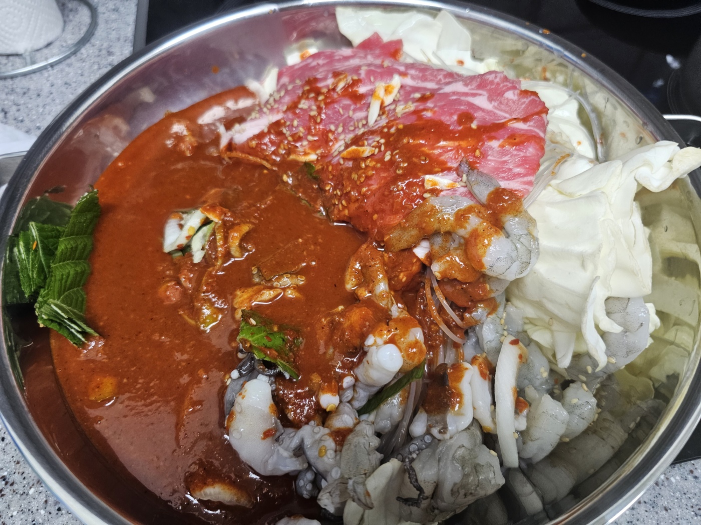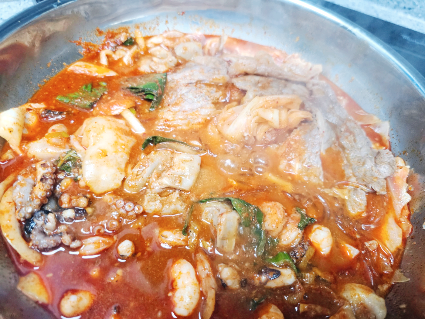 ③ 국물이 자작해지면 약불로 줄인 후 뚜껑을 제거하고 우삼겹, 낙지, 곱창, 새우, 당면, 야채가 완전히 익을 때 까지 조리하십시오. 기호에 따라 남은 소스에 동봉된 우동사리면을 볶아드십시오.