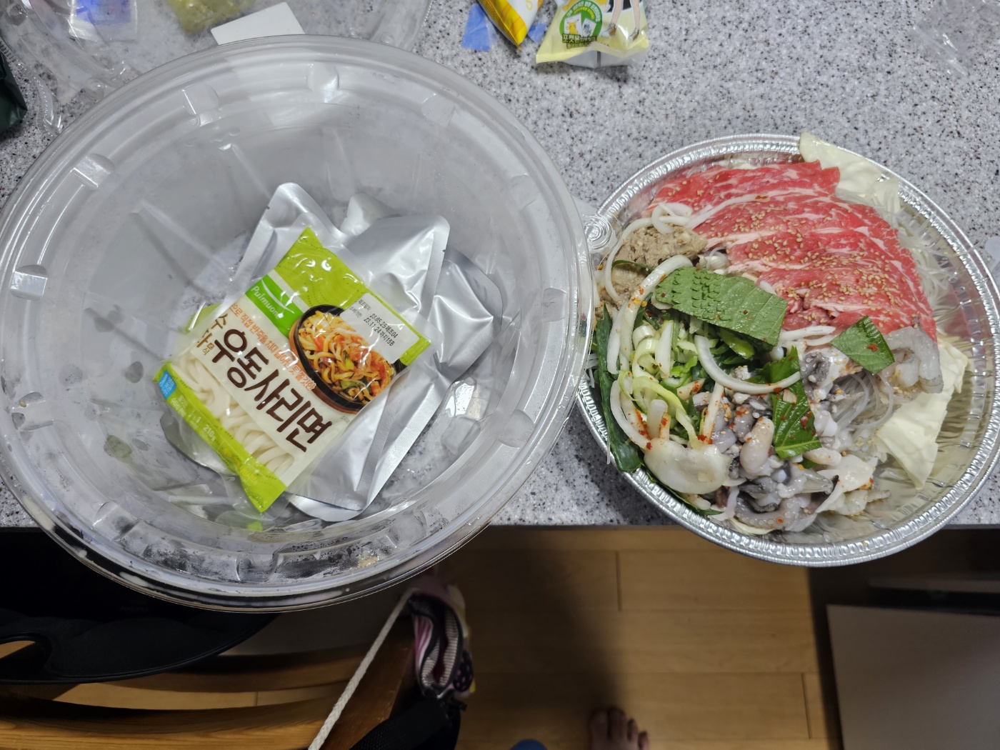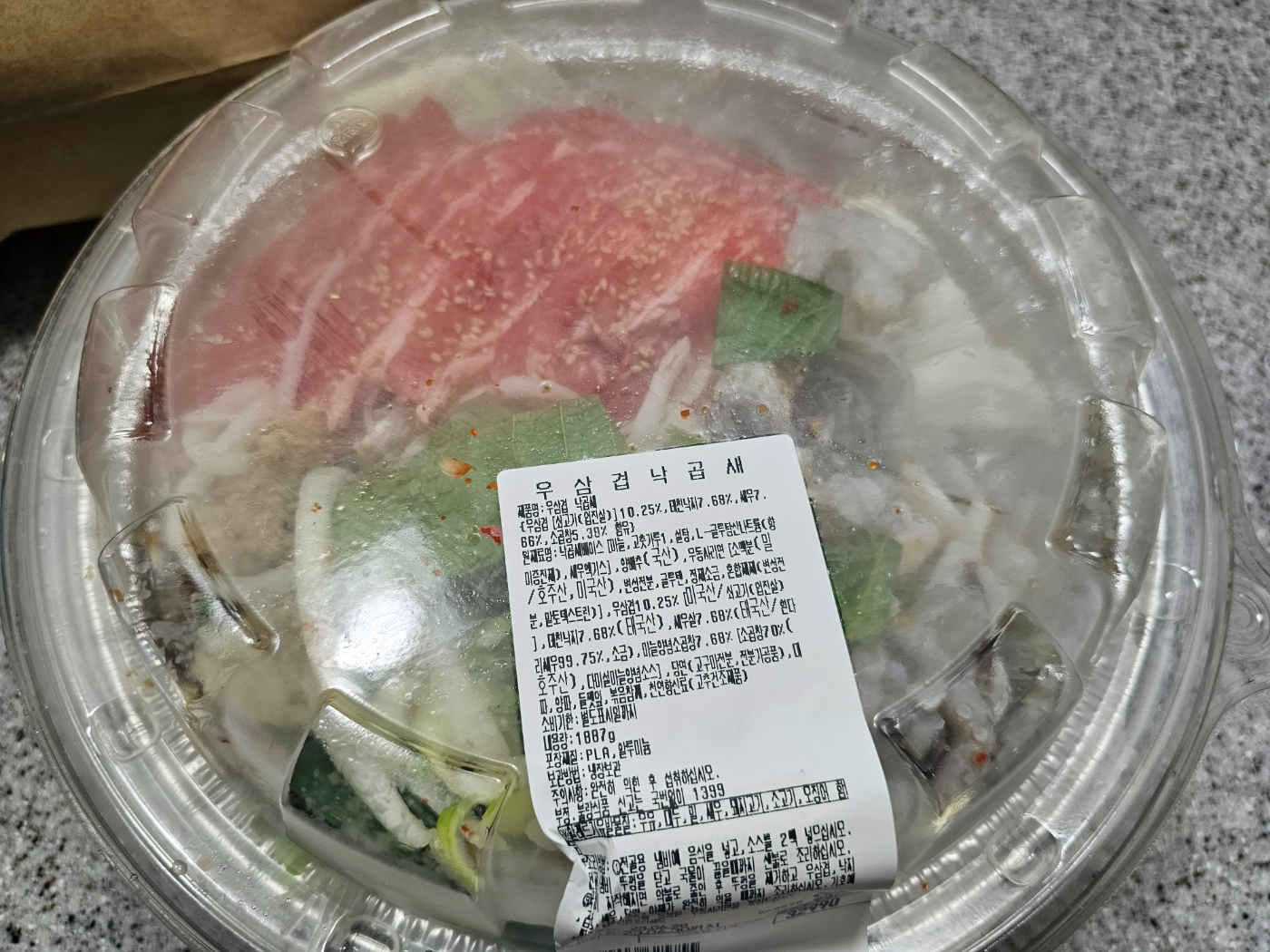 우삼겹이 먹음직스러운 빛깔로 반겨줍니다. 투명한 뚜껑을 열면 알루미늄 냄비에 재료들이 들어있고 그 아래에 풀무원 우동사리면과 낙곱새 베이스 두 봉지가 들어있습니다. 냄비에는 우삼겹, 곱창, 낙지, 새우, 당면, 야채들이 푸짐하게 들어있습니다. 플라스틱 용기가 커서 냉장고에 넣기도 난감합니다. 냉장 보관하려면 테트리스를 아주 잘 해야 합니다. 냉장고 정리에 소질이 없어서 바로 먹어야겠습니다.