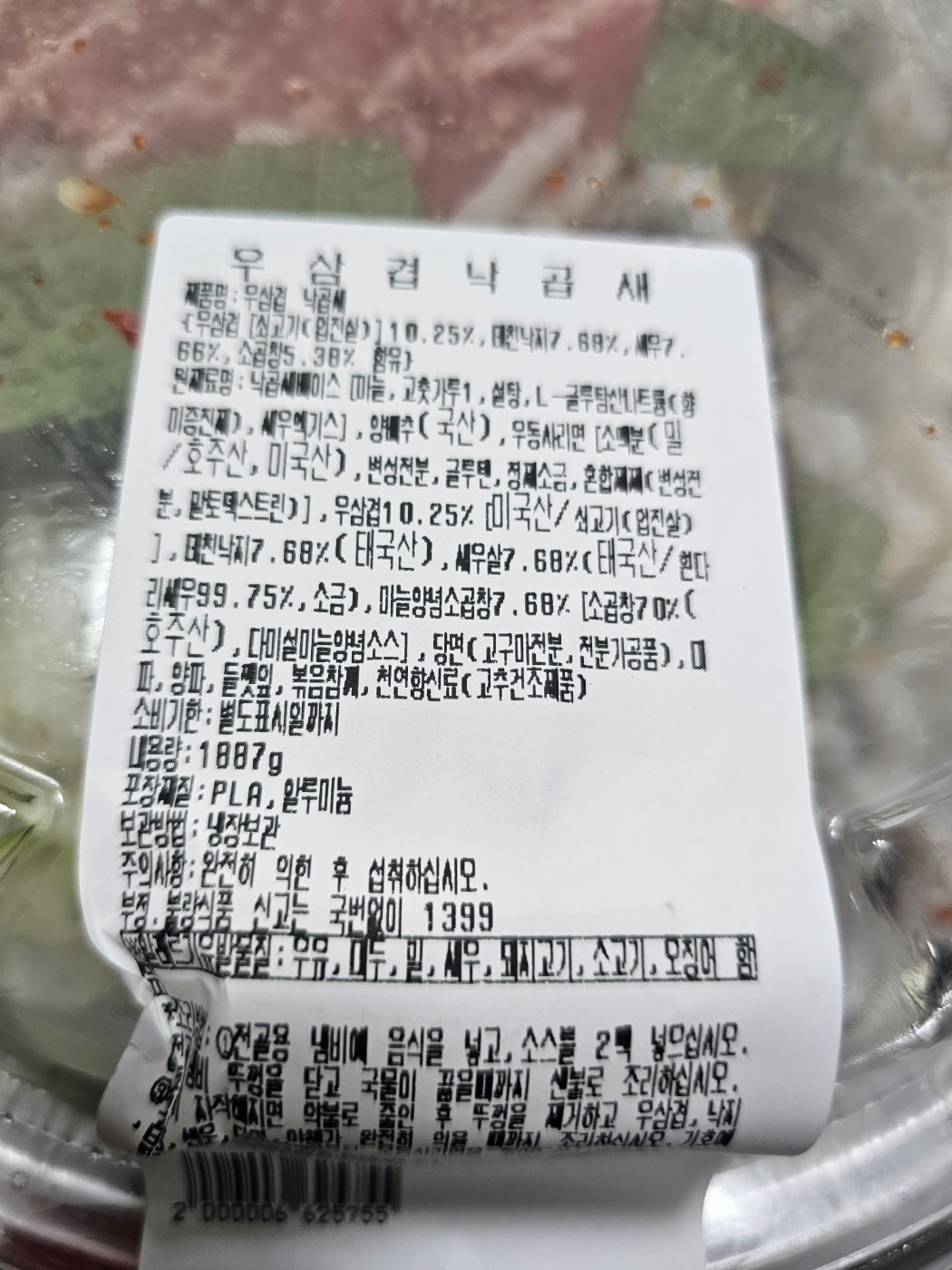 · 내용물 : 낙곱새 베이스 [마늘, 고춧가루. 설탕, L-글루탐산 나트륨(향미증진제), 새우 엑기스], 양배추 (국산), 우동사리면 [소맥분 (밀/호주산, 미국산), 변성전분, 클루텐, 정제소금, 혼합제제(변성전분, 말토텍스트린)], 우삼겹 10.25% [미국산 / 쇠고기(업진살)], 데친낙지 7.68%, [태국산], 새우살 7.68% [태국산/흰다리새우 99.75%, 소금], 마늘양념소곱창 7.68%[소 곱창 70%(호주산), 다미설마늘양념소스], 당면(고구마전분, 전분가공품), 대파, 양파, 들깻잎, 볶음참깨, 천연향신료(고추 건조제품)