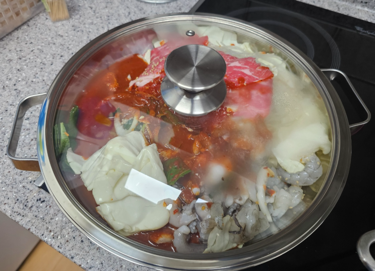 포장에 적혀있는 조리법입니다. 잘 읽어보지 않았다면 알루미늄 용기째 올릴뻔했습니다. 전골냄비에 옮겨 담으니 우리 집에서 제일 큰 전골냄비가 꽉 찹니다. 이 많은 걸 맛있게 먹을 생각을 하니 벌써 기분이 좋아집니다~^^ 소스 두 봉지를 남김없이 부어주었습니다. 요리는 항상 어렵기 때문에 꼼꼼히 읽어보고 따라 해 보았습니다. 물을 넣지 않아도 되는 건지 한참 고민했습니다. '일단 시키는 대로 해보자' 뚜껑을 닫고 강불로 올려줍니다. 맛있는 냄새가 솔솔 올라옵니다.